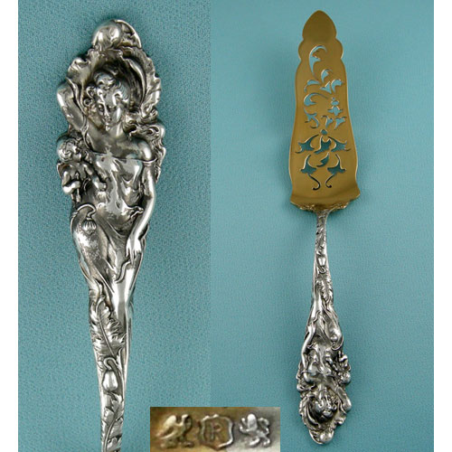 Reed & Barton’s Love Disarmed pattern was first introduced in 1899. Seen here on a vermeil-tipped sterling silver petifore server. Via Léonce Antiques.