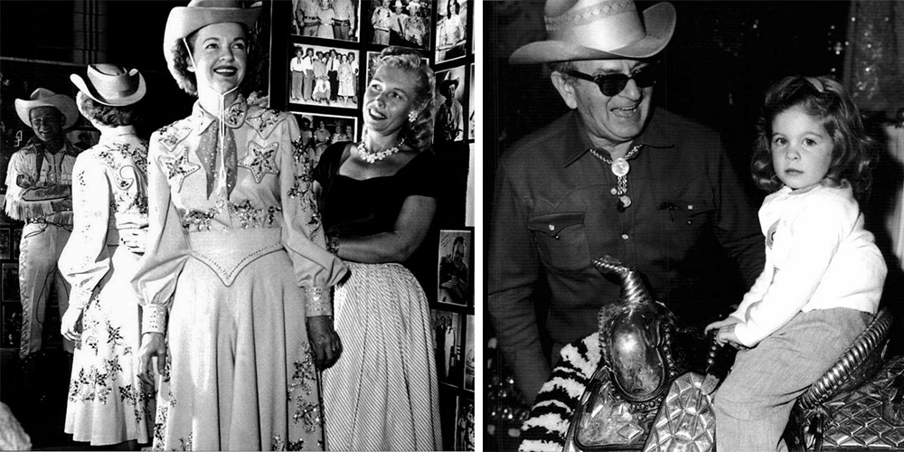 Left, Nudie’s wife Bobbie Cohn fits Dale Evans for a custom outfit as Roy Rogers looks on. Right, a serious Jamie Lee gets a laugh out of her grandfather at the store.