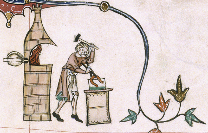 Marginalia also offers a visual record of what ordinary things looked like in the medieval era, like this image of a man working on a forge from the Gorleston Psalter, c. 1310-1324. (British Library Royal MS 49622, f. 193r.)