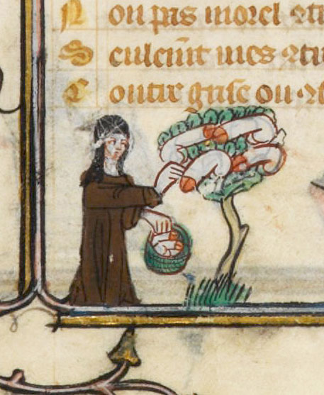 A nun plucks penises off a phallus tree in the Roman de la Rose, c. 1325-1353. (Paris, Bibliothèque nationale de France, MS. Fr. 25526, f. 106v.)