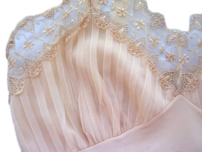 A closeup of the bodice of a beige vintage Val Mode slip with pintucked accordion pleats. Via aslipofagirl.net.