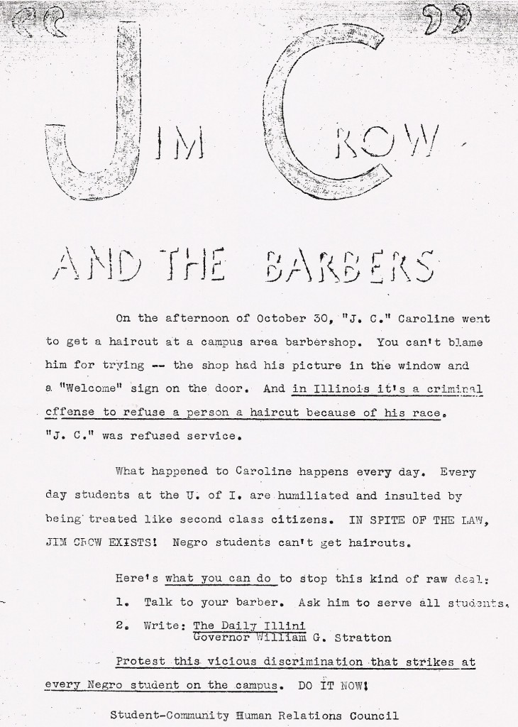 This 1960s flyer from the University of Illinois calls for students to urge barbers to serve all patrons or else boycott them.