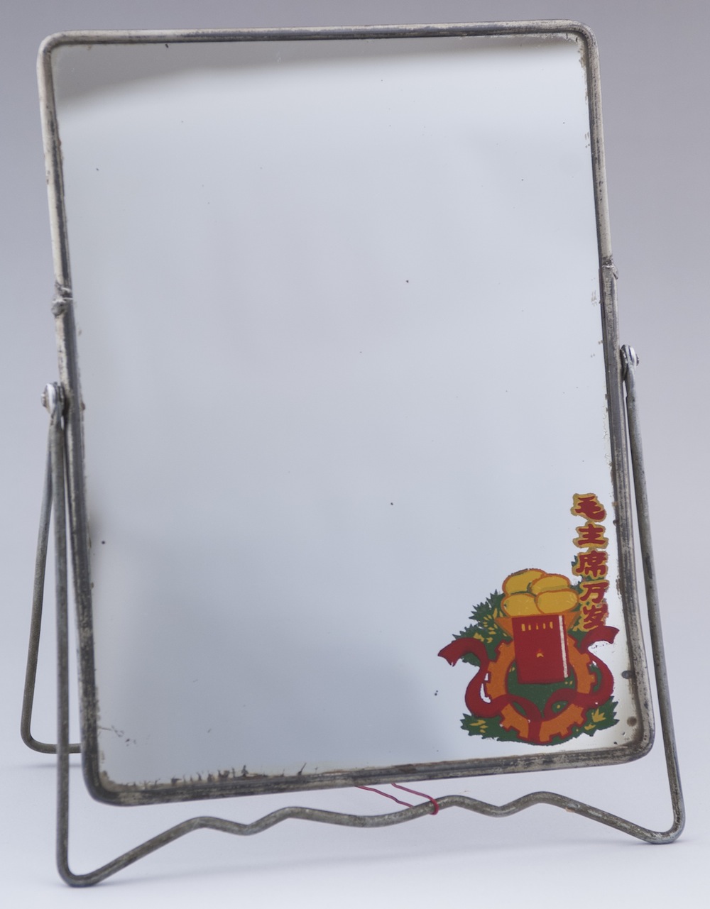 This vanity mirror is decorated with mangoes and a cog (both symbols of workers), as well as a depiction of “Quotations from Chairman Mao Zedong,” known in the West as “The Little Red Book.” The inscription reads, “Long life to Chairman Mao.”