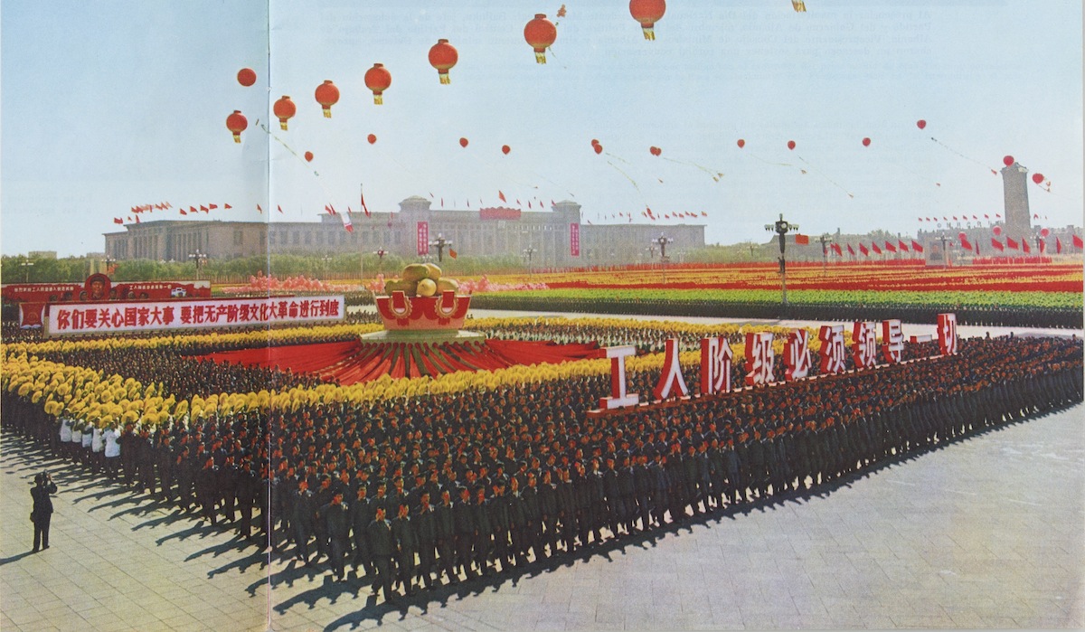 A mango float at the October 1, 1968, National Day Parade in Tiananmen Square. The front characters read, “The working class must exercise leadership in everything.”