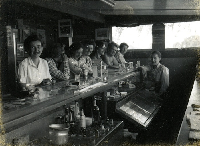 Above: Women crowd the bar at the Pyramid Lake Guest Ranch north of Reno. Top: A postcard from the 1940s depicts the practice of tossing one’s wedding ring into the Truckee River from the Virginia Street Bridge after being granted a divorce. Both photos courtesy Special Collections, University of Nevada-Reno Library.
