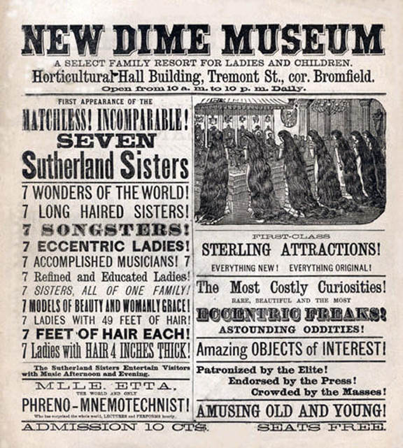 Top: (From left), Sarah, Naomi, Fletcher, Grace, Victoria, Dora, Mary, and Isabella Fletcher. Above: An ad boasting a Seven Sutherland Sisters performance may have exaggerated the collective length of their hair. (Images via Sideshow World)