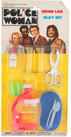 A peculiar crime lab play set was produced in conjunction with the “Police Woman” TV show.