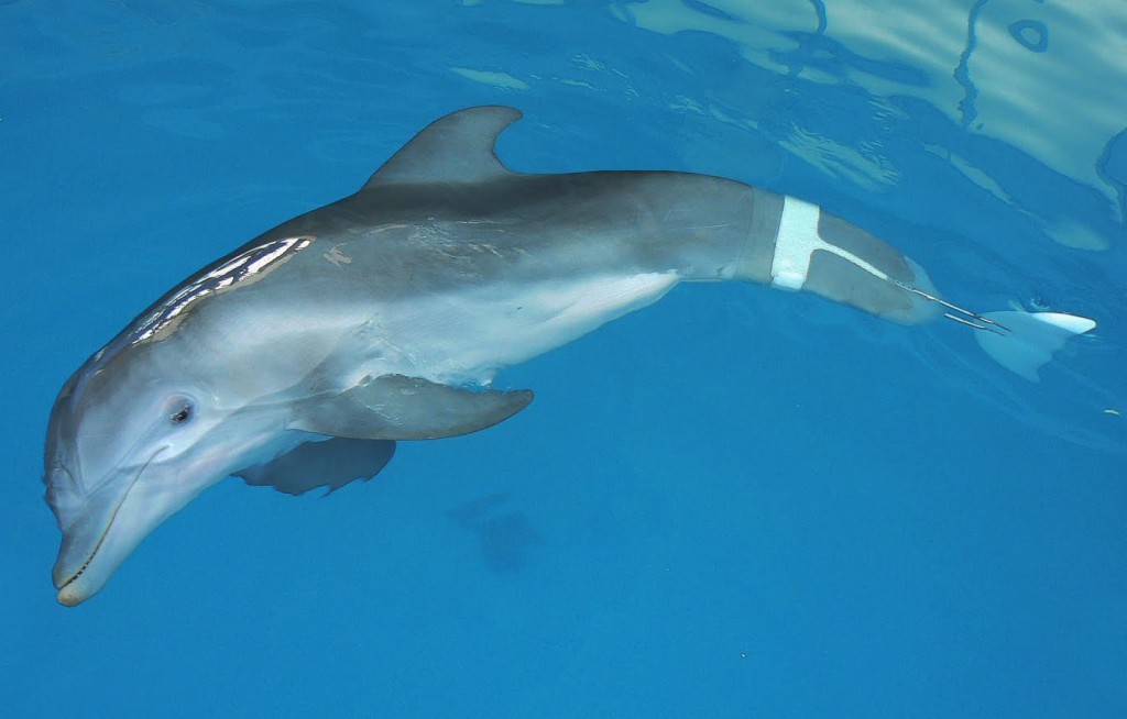 Winter, the dolphin, wears an early prosthetic prototype designed by Dan Strzempka and Kevin Carroll.