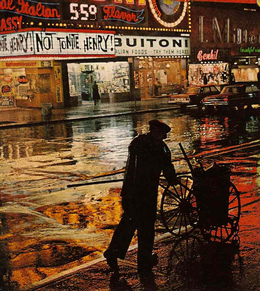 Top: An early image of the sanitation department collecting trash, circa late 1890s. Photo courtesy DSNY. Above: A street sweeper, or “San Man,” in Midtown Manhattan in 1964. Via National Geographic.