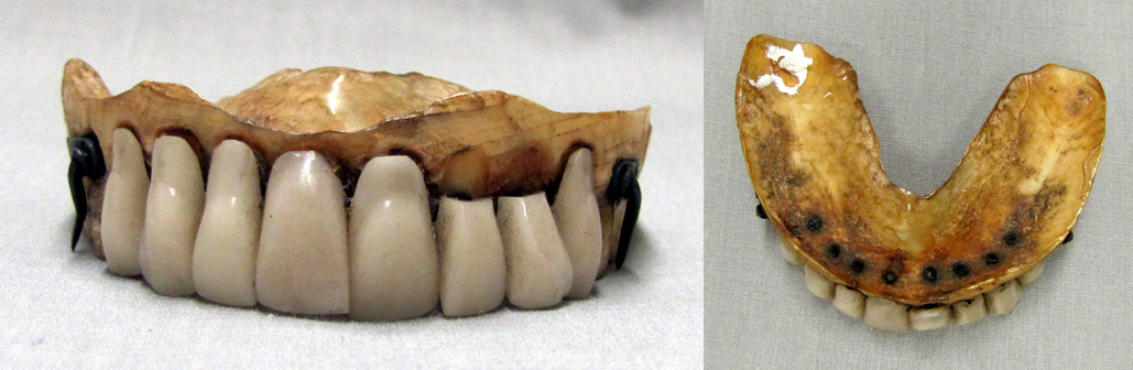 Left, this lower set of Washington’s ivory dentures included a hole for his last remaining tooth. Via the New York Academy of Medicine. Right, this complete set of Washington dentures was made from animal and human teeth, ivory, and lead. Via the Mount Vernon Estate.