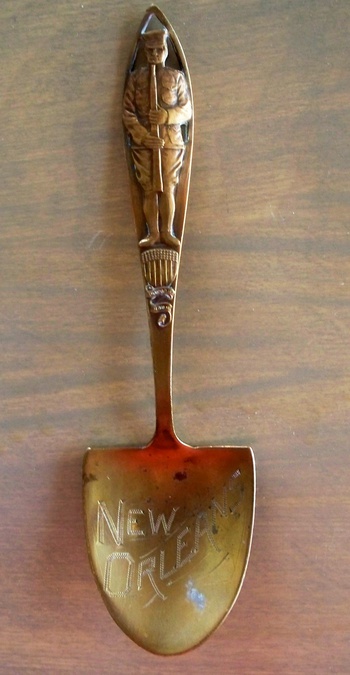 Found this 5-inch Shovel spoon with a Soldier with rifle standing on a US shield with E pluribus Unum. Marked bronze on backside.
