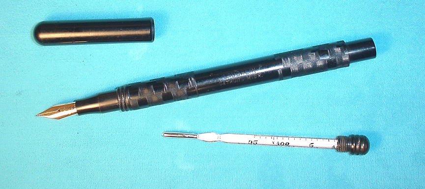 Doctors' pens are fountain pens that hark back to the era of house calls and doctor's bags. Doctor's pens came with a thermometer. Some models actually concealed a thermometer inside the pen barrel. Others came in sets, with a thermometer in its own case matched to a fountain pen and pencil