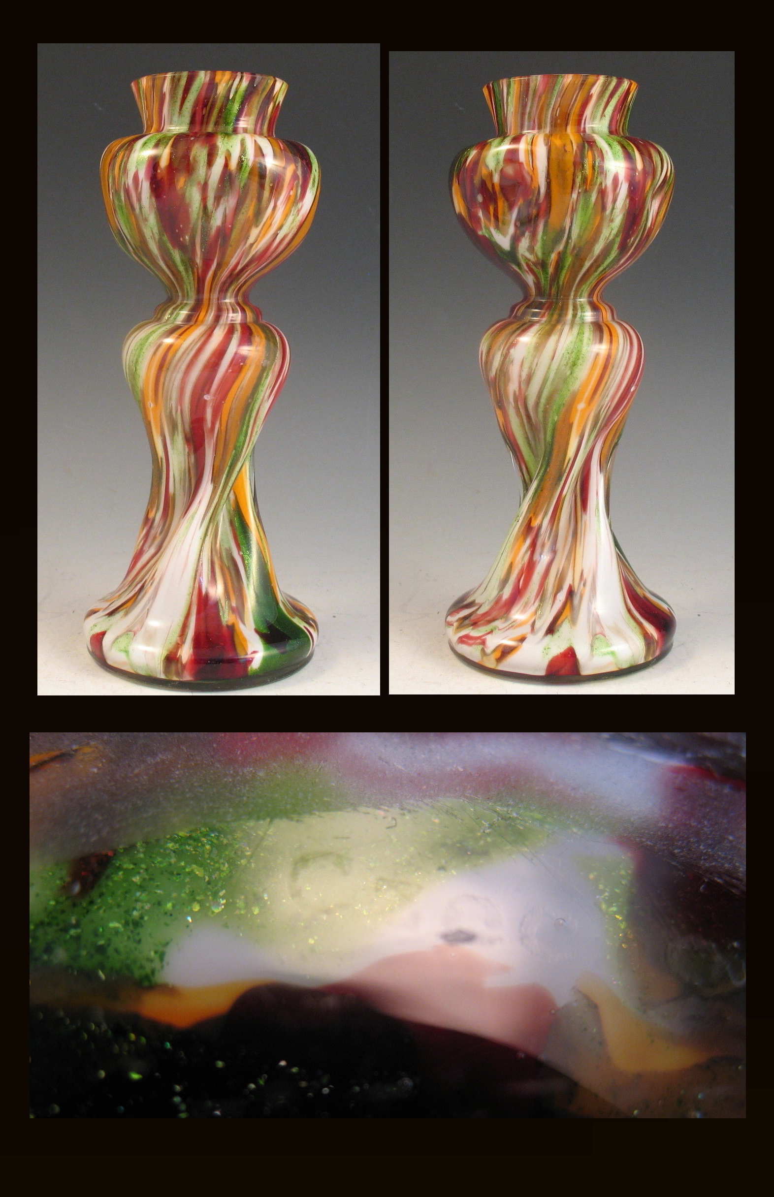 This is an established Welz shape seen in a number of pastel and confetti/spatter décors. It is, to me, high late Art Nouveau, being organic (base, stem, neck, flower head), material (twist, dimple, surface) and functional (bulb, flower stem).