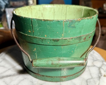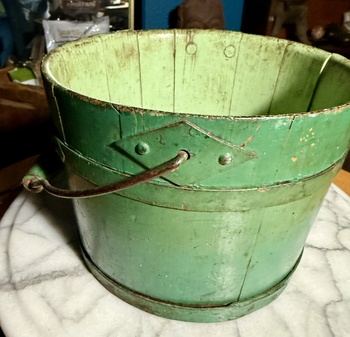 My parents got this when i was a kid. I've always liked it and they gave it to me when i was home vacationing last week. it's from the Enfield Shaker Community. I like how the inside is a different color green than the outside. apparently, the diamond-shaped piece is a sign of Shaker craftsmaship. it's so well made that i've used it to hold water. I was looking at it tonight and i think i found some initials in the bottom of it. Something like an S X. i wonder if this was the name of the maker or the owner. It's so beautifully made. I found some similar ones which had sold at auctions for a surprising amount. Any experts in Shaker furniture out there? I'm wondering if it is a known signature.