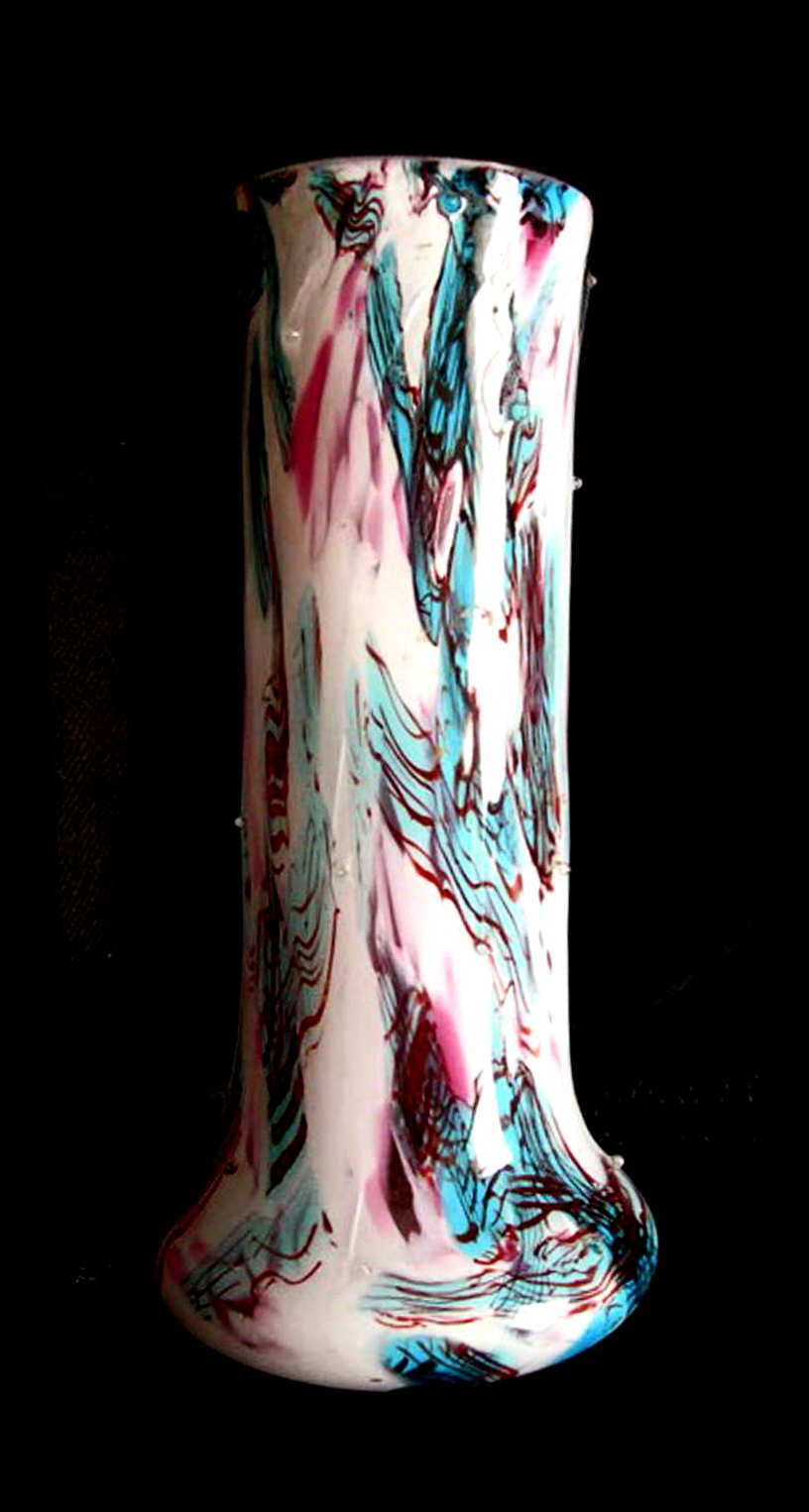 OK I admit I know nothing about these. I have no idea on age: mid-century, older, newer? I can't guess country of origin. I'm just intrigued and bedazzled by their beauty. Small vase is 7 3/4" tall. 3 3/4" at base on up to 2 5/8" at mouth. Larger companion is 10 1/8" tall. 4 1/4th" at bottom. 3 3/16" at mouth. Anyone have any ideas, or experience with this type of glass?