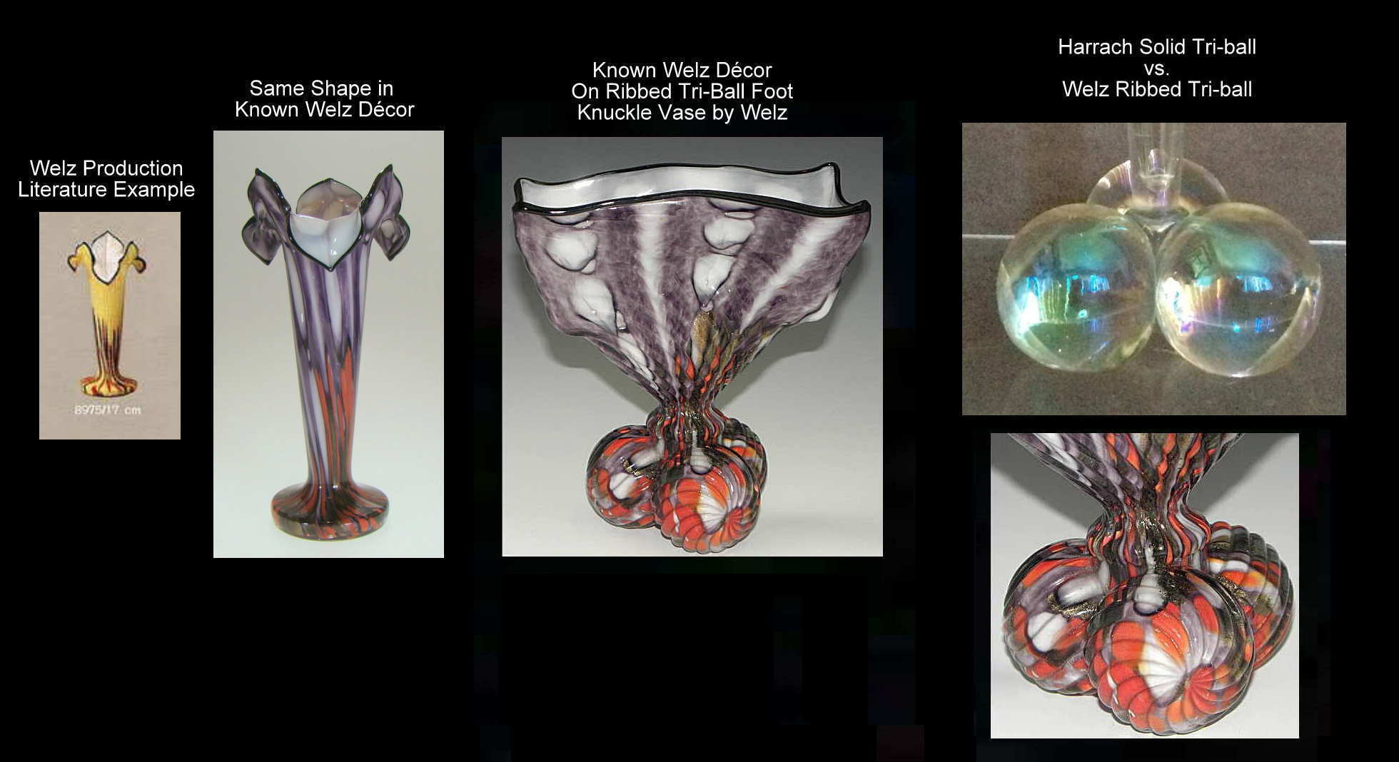 The comparison of a solid, clear glass, smooth surface three ball foot design made by Harrach, to the Welz ball foot which is both hollow and always ribbed, at least to me, is completely absurd. Especially when used to form and support an opinion regarding an attribution for the ribbed ball foot production. The two designs are apples and oranges.... if even that close. More like apples and bowling balls....