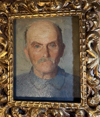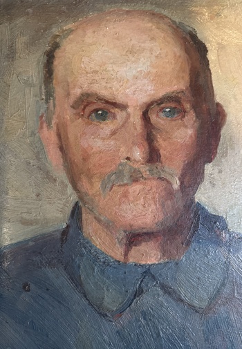 I'm pretty sure that this painting is of a Poilus - a French soldier from WW1. His moustache and the collar of that blue shirt are indicative of that. I'm going to put in a better photo of it now.