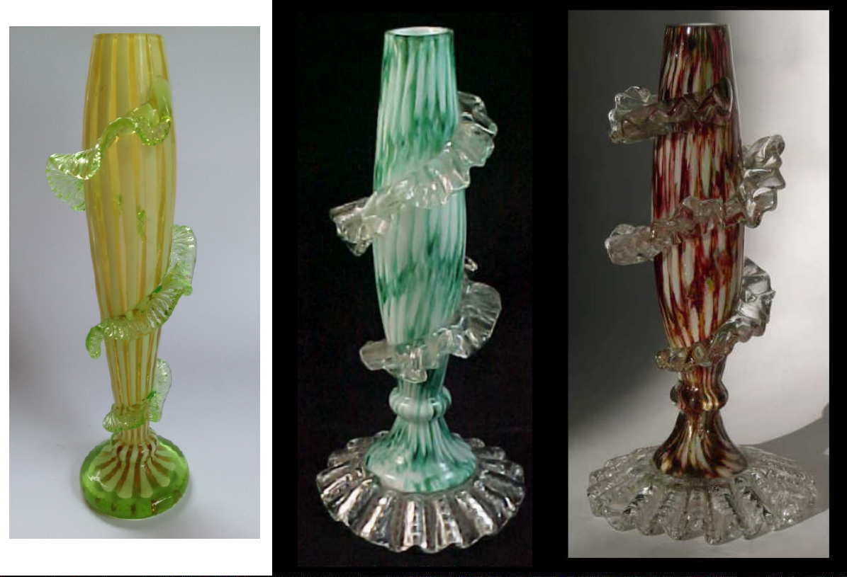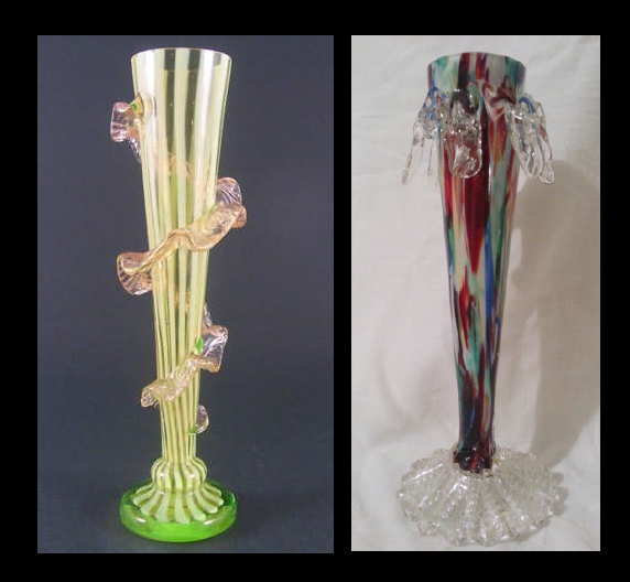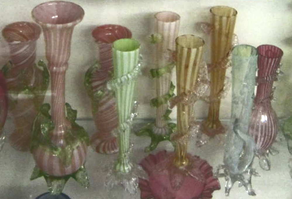 In this last image we have examples of what I believe to be a Harrach vase on the left and a Welz vase on the right.
