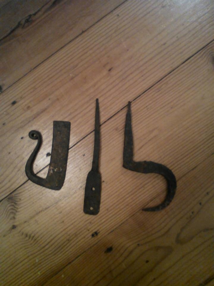 Not sure about the others, the spikes seem to be for hammering into timber. Maybe some kind of door fittings??