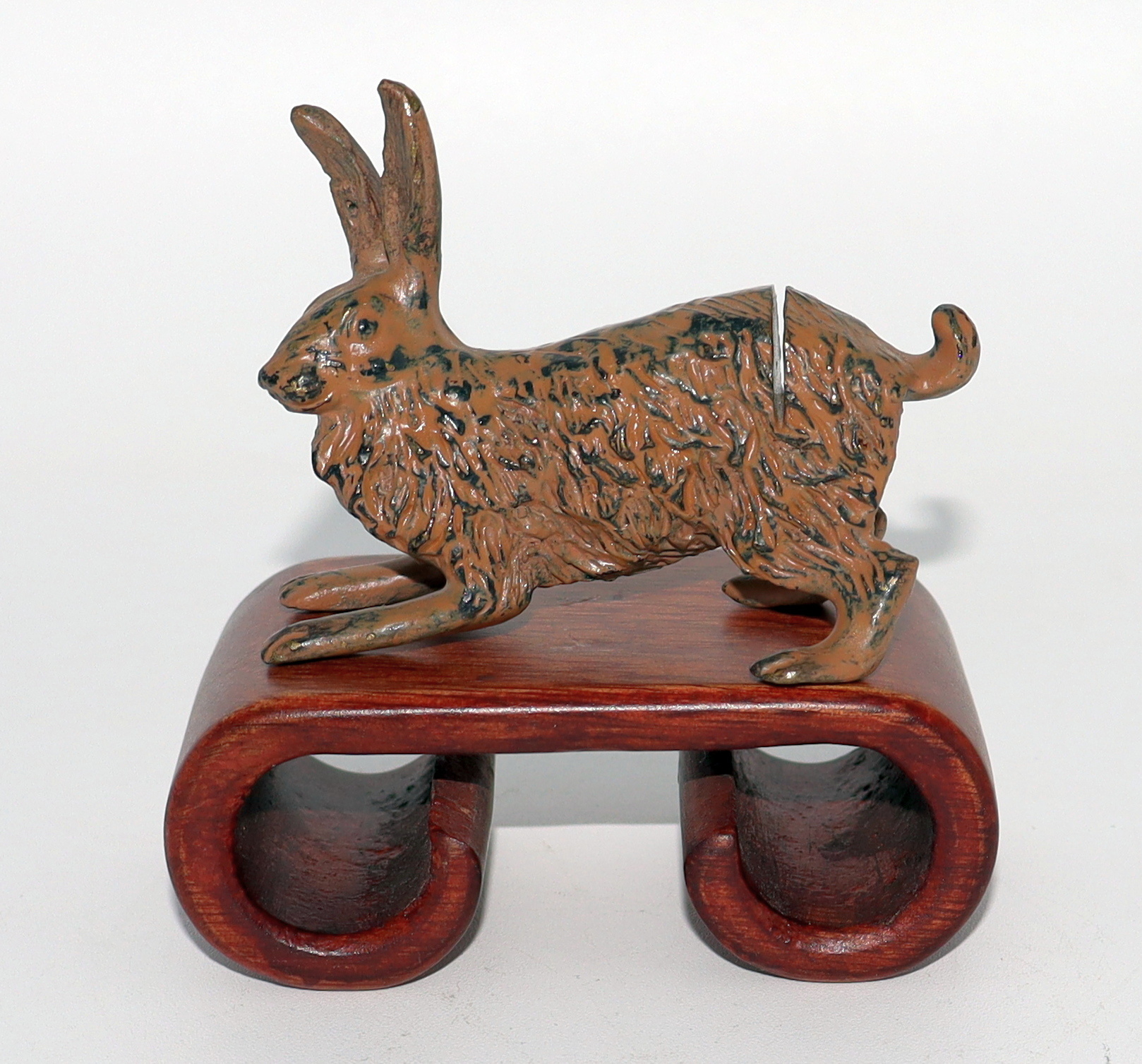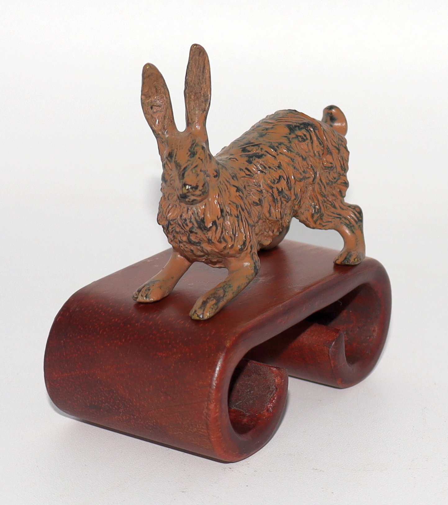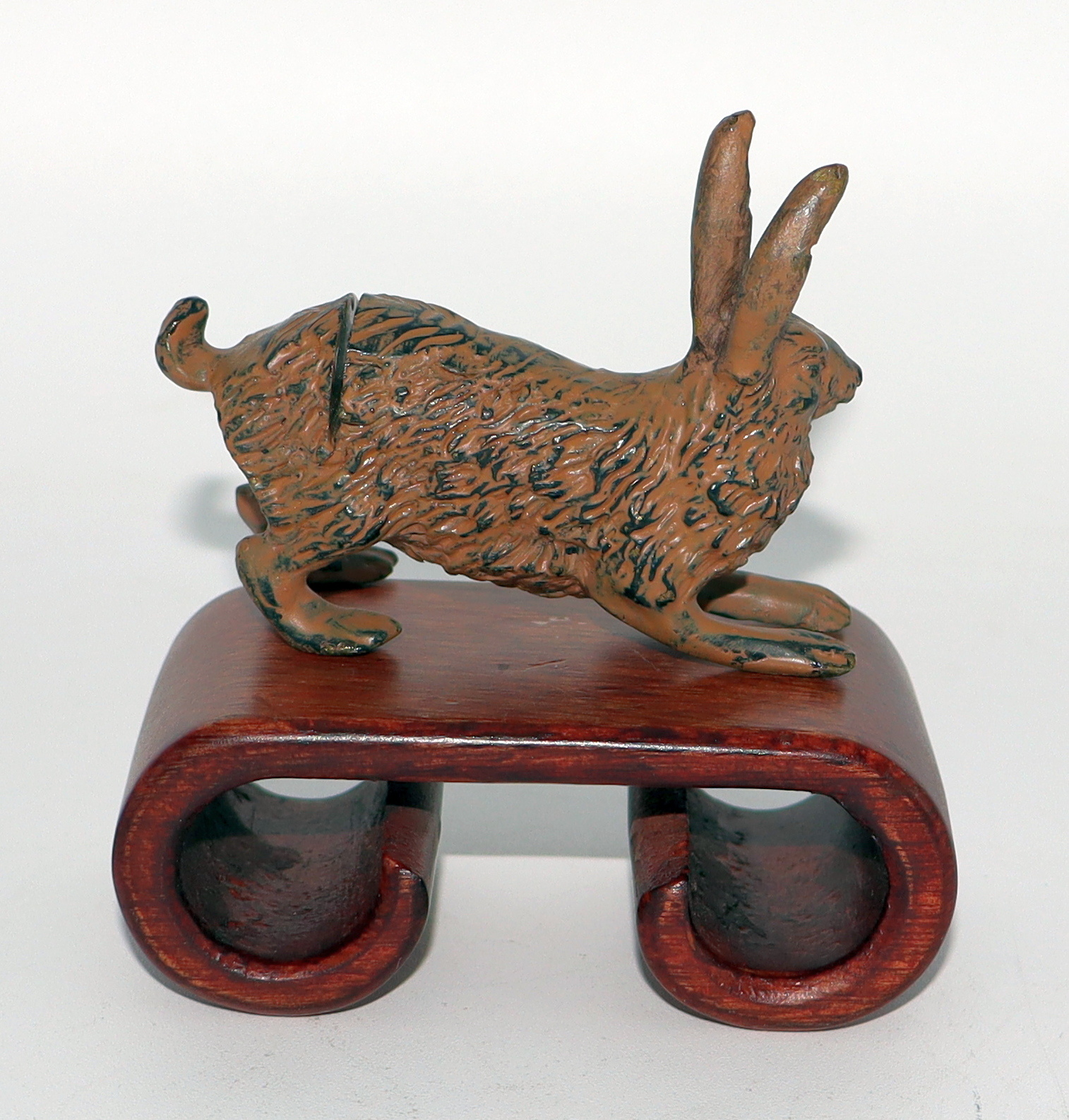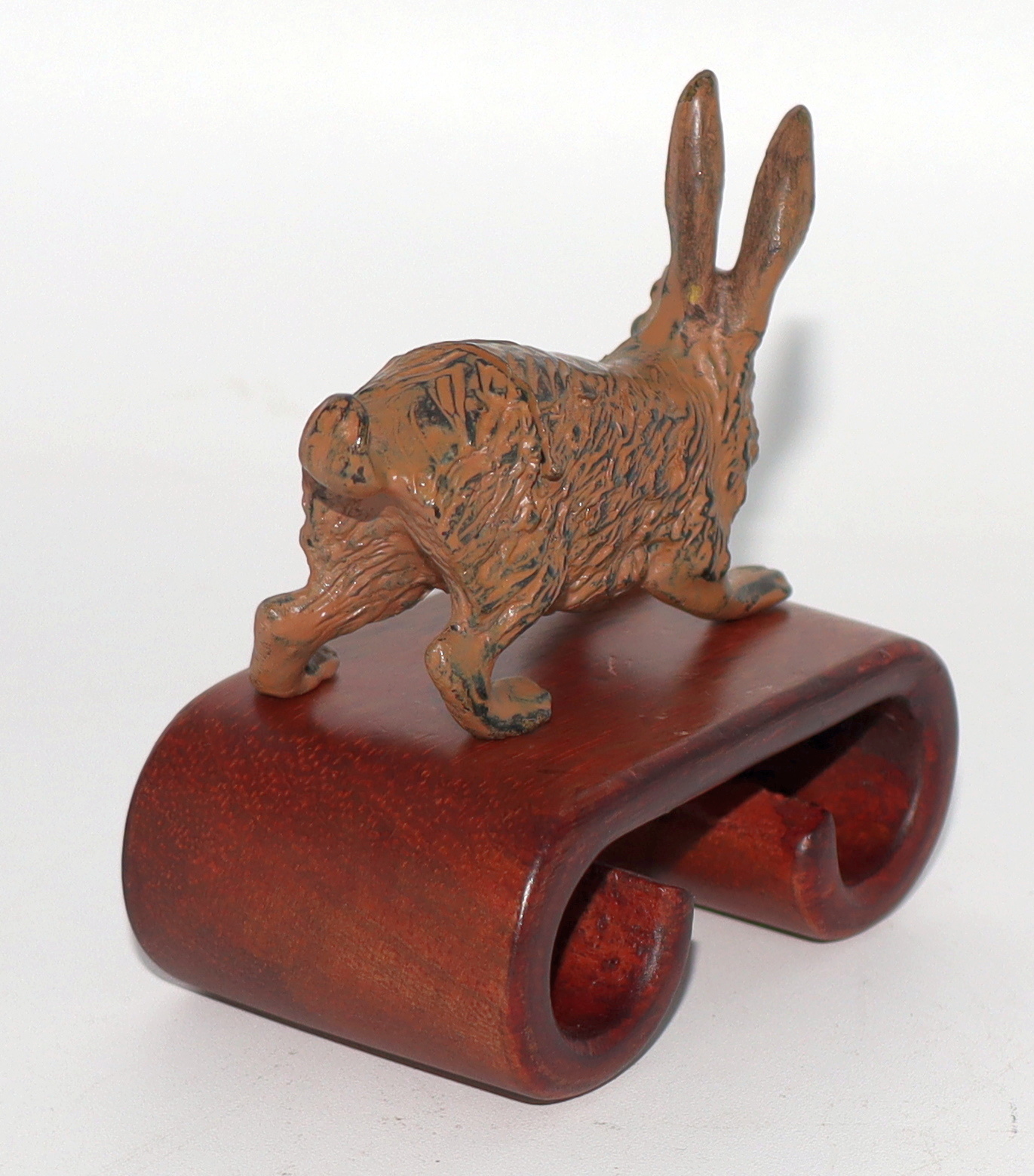 I've had this little fellow for quite some time now. It's a solid bronze cold painted hare place card holder. This would have been a child's party favor, from many years ago. Can you imagine giving something like this away to a child as a party favor? I'm sure many of these got lost or broken, but this little guy survived. He's small and only measures 2 3/4" long and nearly 2" tall.