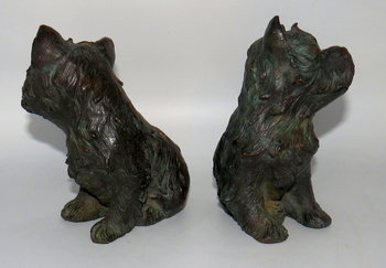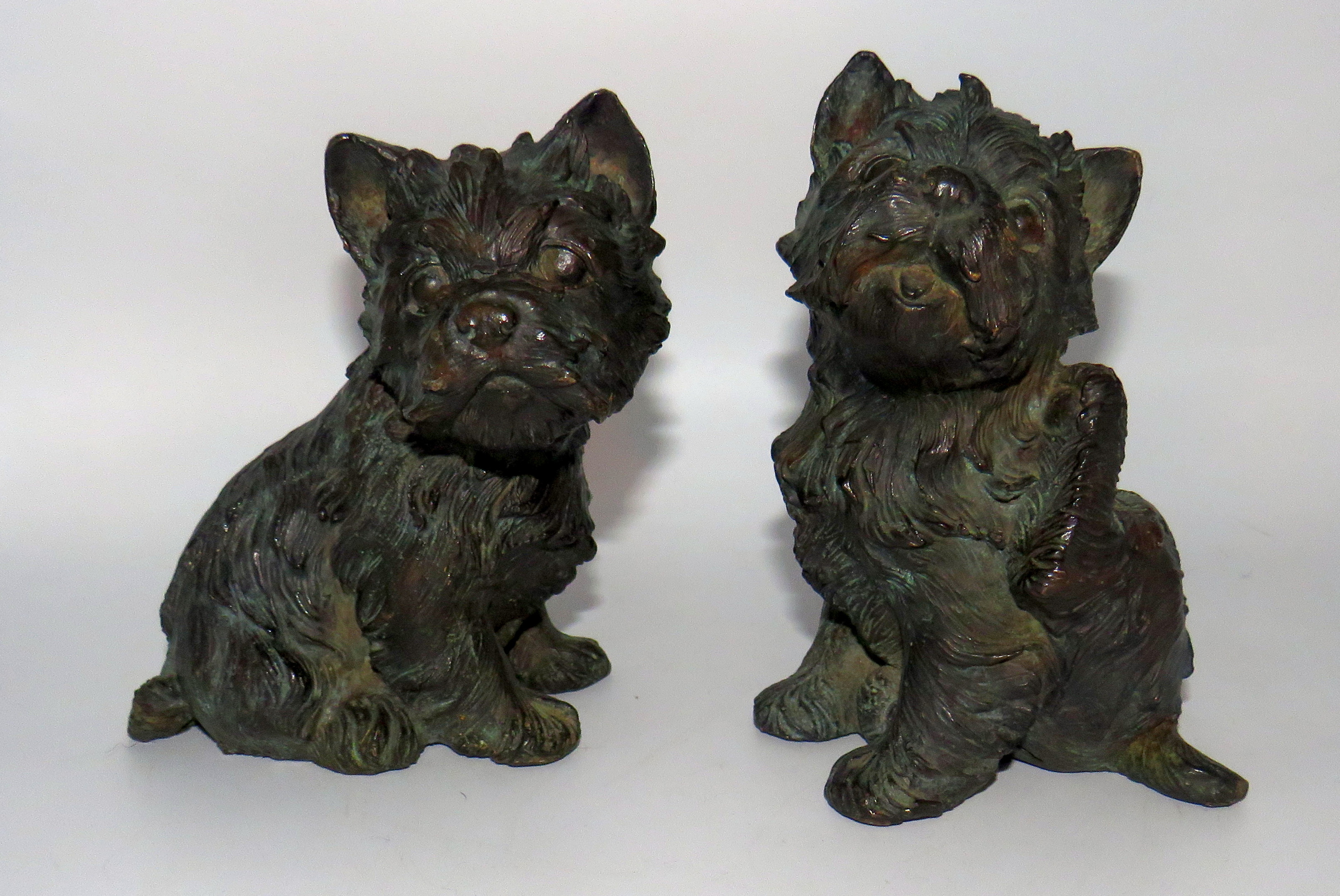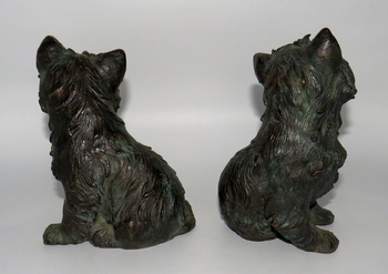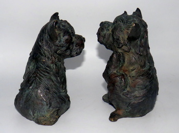 I found this set of vintage (possibly antique) West Highland "Westie" terrier bronze sculptures recently. I love their poses, especially the one on the right that's scratching. They're very well detailed and they caught my eye instantly. Both have a really nice patina, which tells me that these sculptures have quite a bit of age to them. They were quite dirty when I bought them and they took quite a bit of cleaning, but, they cleaned up nicely and are a very welcome addition to my collection. These fellows measure 6" tall and there are no makers marks that I can detect. I hope you all enjoy seeing these as much as I do.