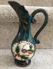 THIS VASE IS A TRUE SURVIVOR MY CHILDREN HAVE KNOCKED IT OVER MANY TIMES AND THOSE HANDLES ARE STILL INTACT, BUT I'M NOT TAKING ANY MORE CHANCES NOW IT SITS ON A HIGH SHELF! I LOVE THE SHAPE AND THE MOTTLED GREEN GLAZE WITH THE CUTE LITTLE BIRD SCENE ON THE FRONT