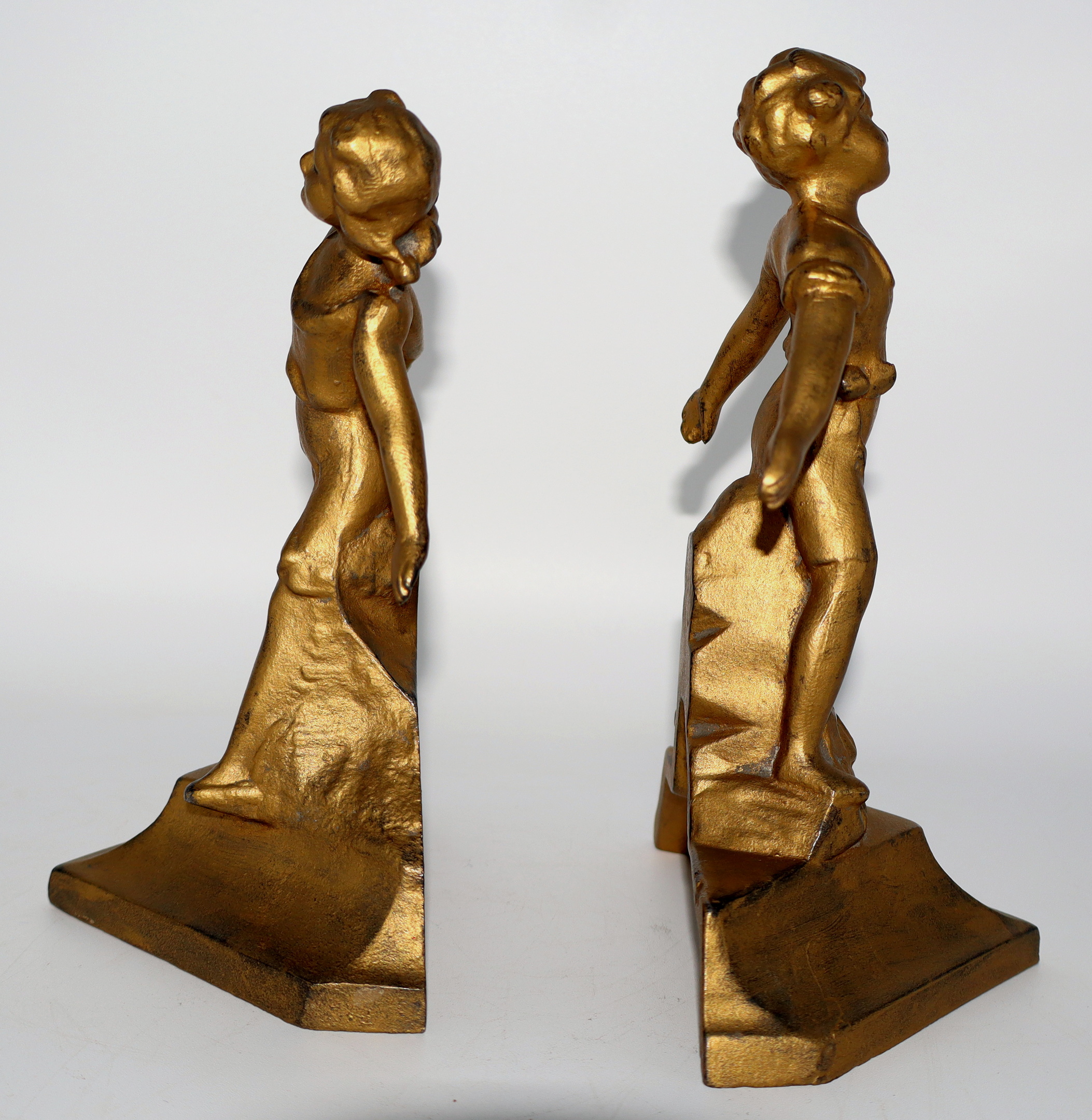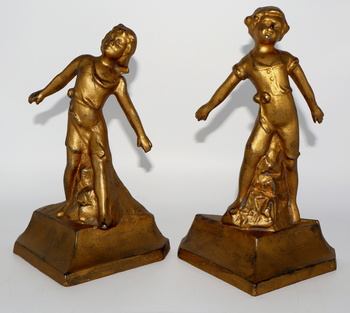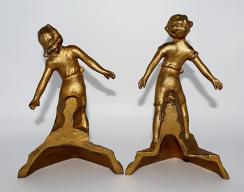 I just acquired this set of cast iron bookends. They were made by Everstyle and were simply titled "Boy and Girl". They were produced in 1930. They both retain most of their original paint. They measure 7" tall. In the bookend world, these would be considered a rare find.