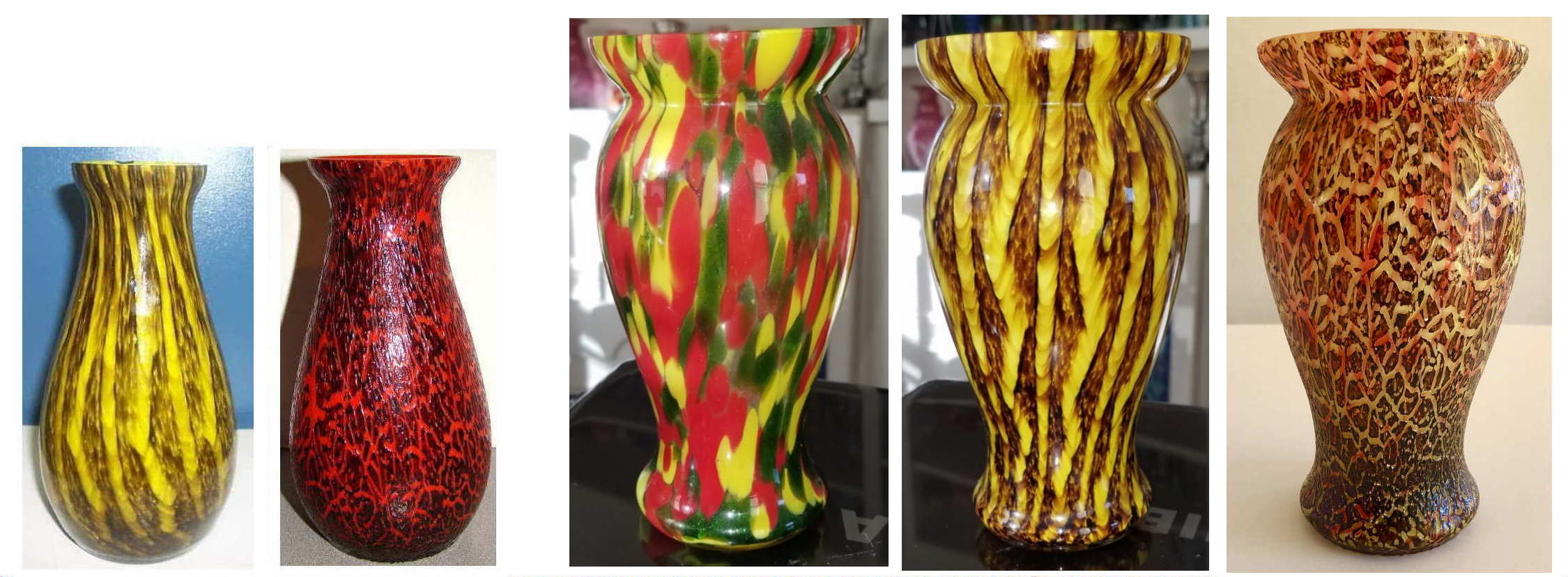 Here is a 7” Czech vase with beautiful decor. I have only seen this two or three times before. It has an orange base color with yellow and red confetti. There is a black color glass on the surface of the glass; it has a crackled texture on the surface. The crackle is usually created by submerging the glass in water which creates cracks to the surface. The resulting cracks are enhanced by blowing more air into the shape. The surface is left rough to the touch