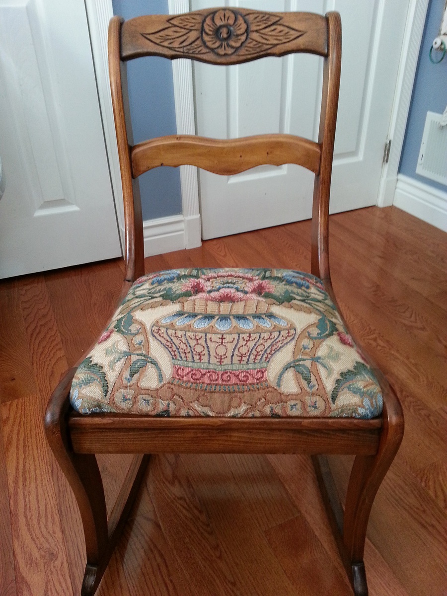 I have a chair just like this,except it has Maroon velvet fabric on seat,the tag on the bottom was torn off.Bought it at a yard sale and wanted to find out about it.Any help you can give me would be great.Thanks