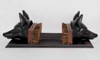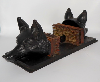 The piece measures 19" long, 6 3/4" wide and weighs roughly 20lbs. I used soft sand to sandblast about 4 coats of thick paint and rust from this boot scraper. Once the sandblasting was complete, I was very impressed with the extreme detailing of the fox heads, from the eyes, mouths, whiskers and ears. I repainted it and replaced the old worn out brushes.