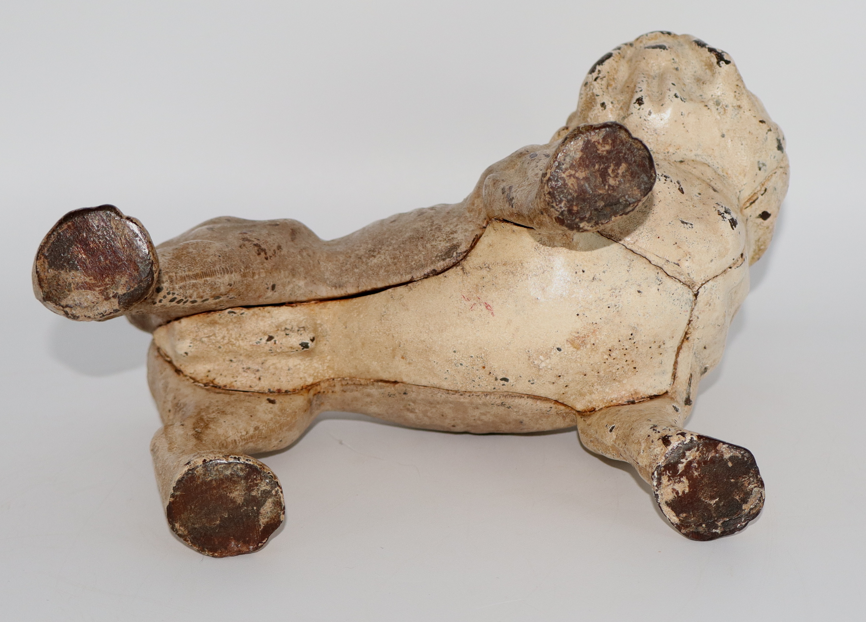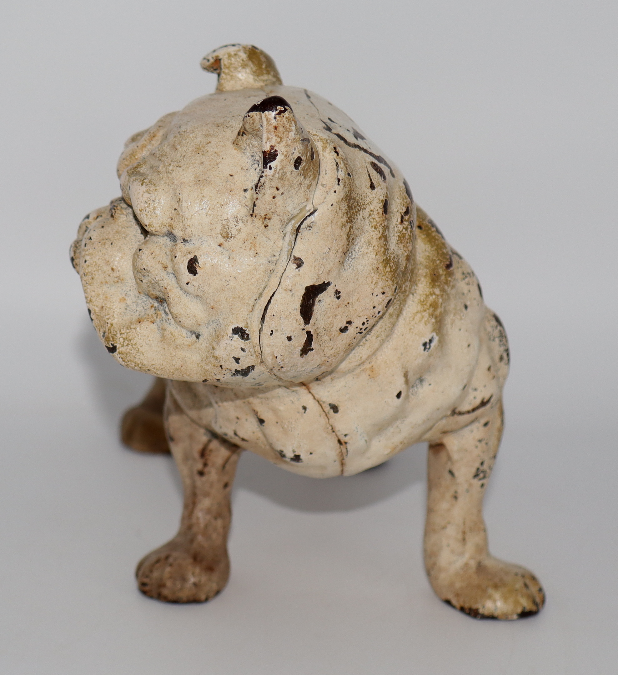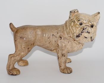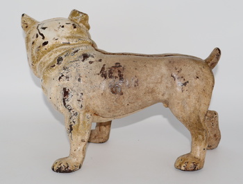 This is the only cast iron English Bulldog still bank that I own. These were produced in the 1920's. I'm not truly sure if Hubley made this one as it was also produced by National and Albany foundries as well. Hubley cataloged theirs as "Bulldog #220". It's original white and tan brindle colors have long since faded away, but still a great little bank. This one is a 3 piece design, held together with a single screw, (shown in pic #4) which was more costly to manufacture, at the time, than the 2 piece doorstop version of similar design. So, the banks tend to be more sought after than the doorstop version. This one stands 8 13/16" long and 6 1/16" tall and weighs 4.3lbs.