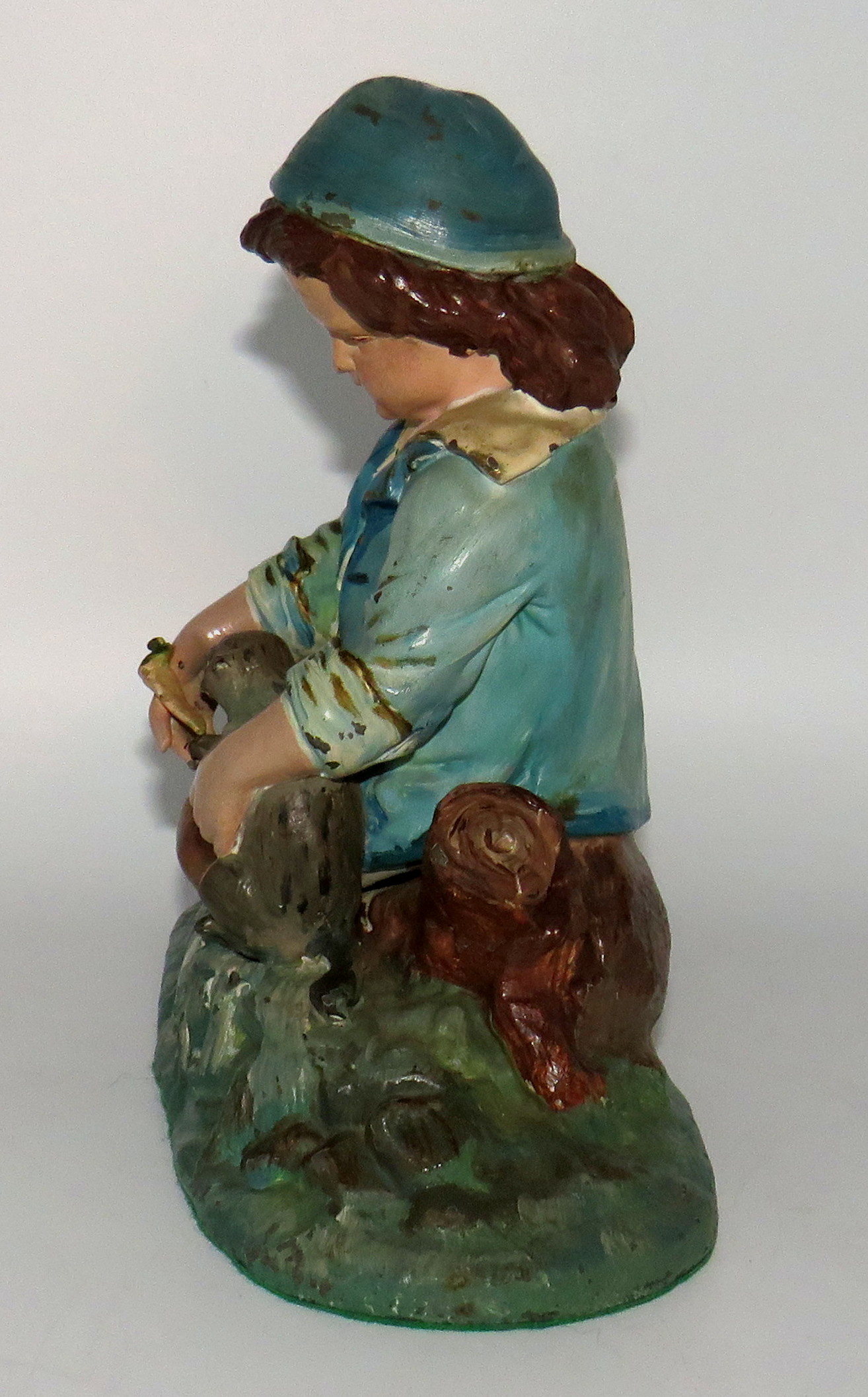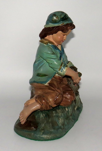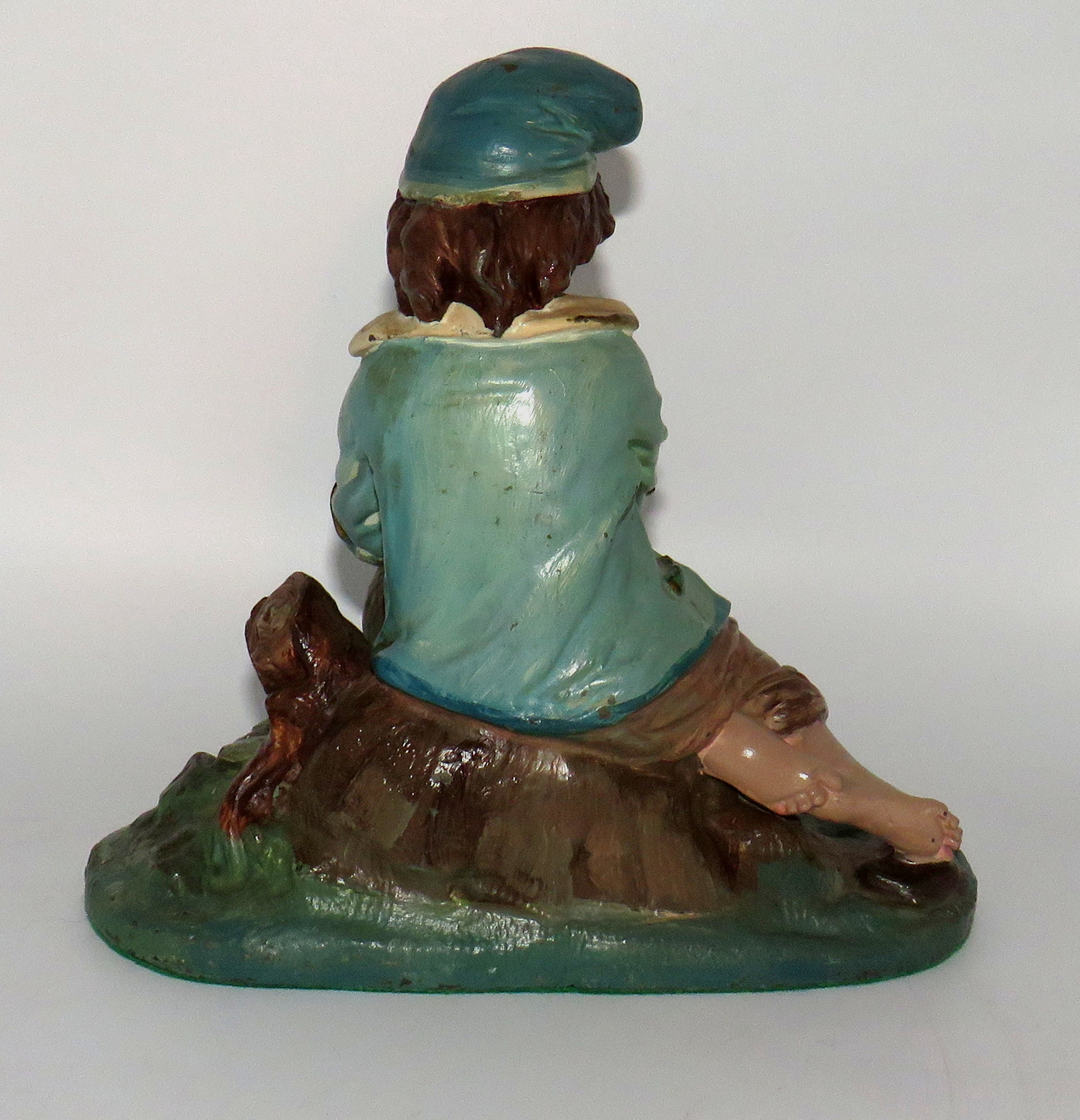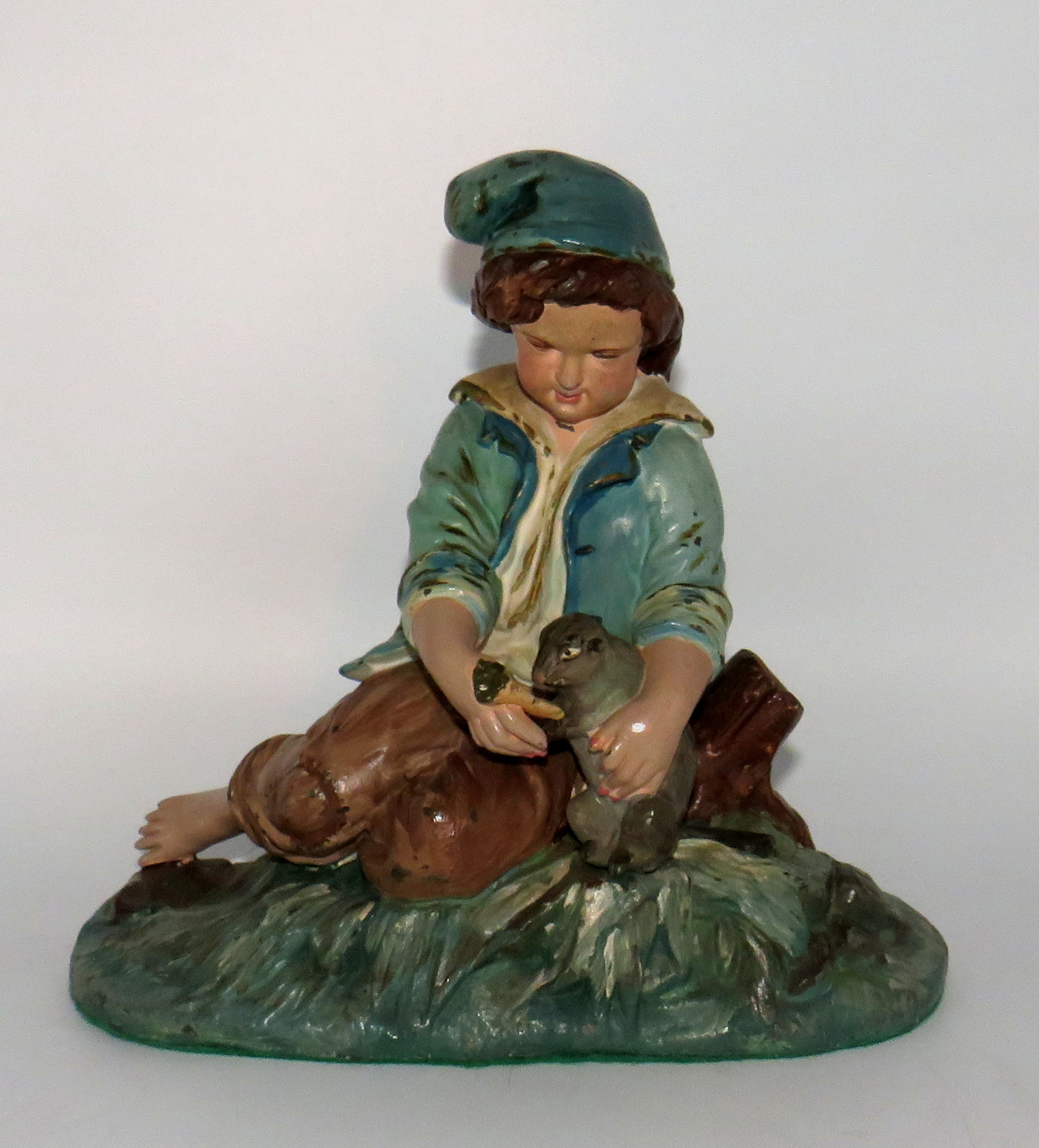 I typically collect doorstops, bookends, bronze sculptures, etc..... But, when I saw this piece it immediately caught my eye and I had to have it in my collection. It's an antique cold painted spelter sculpture of a little boy hand feeding a beaver. It's so wonderfully detailed and beautifully painted. His facial features, as well as his fingers and toes are so incredibly detailed. I'm not sure of the exact age of this piece, but I'd place this in the early 1900's. This sculpture measures 7 1/2" tall, 7 3/4" wide and 3 5/8" deep.