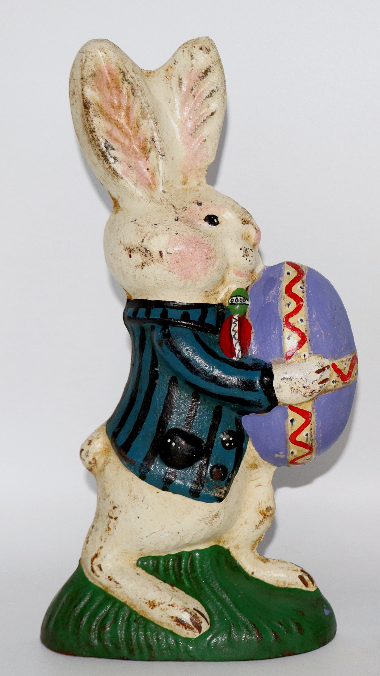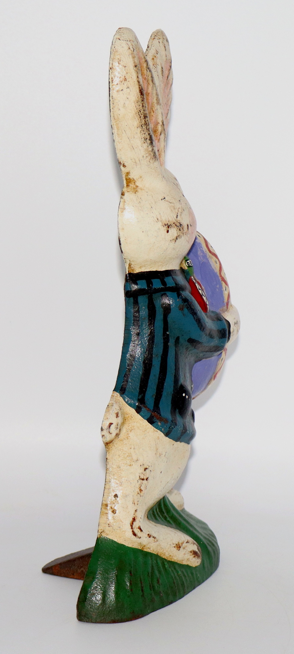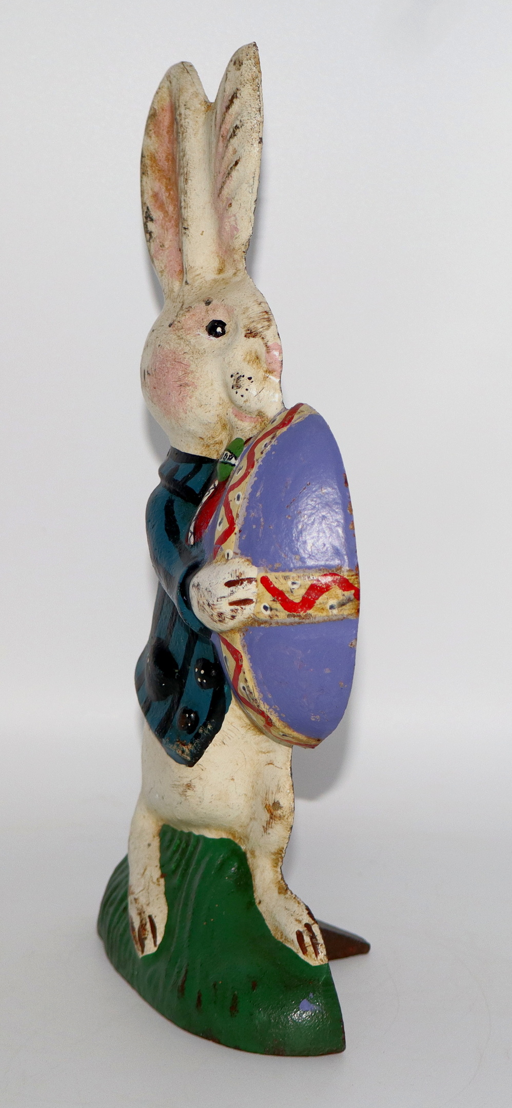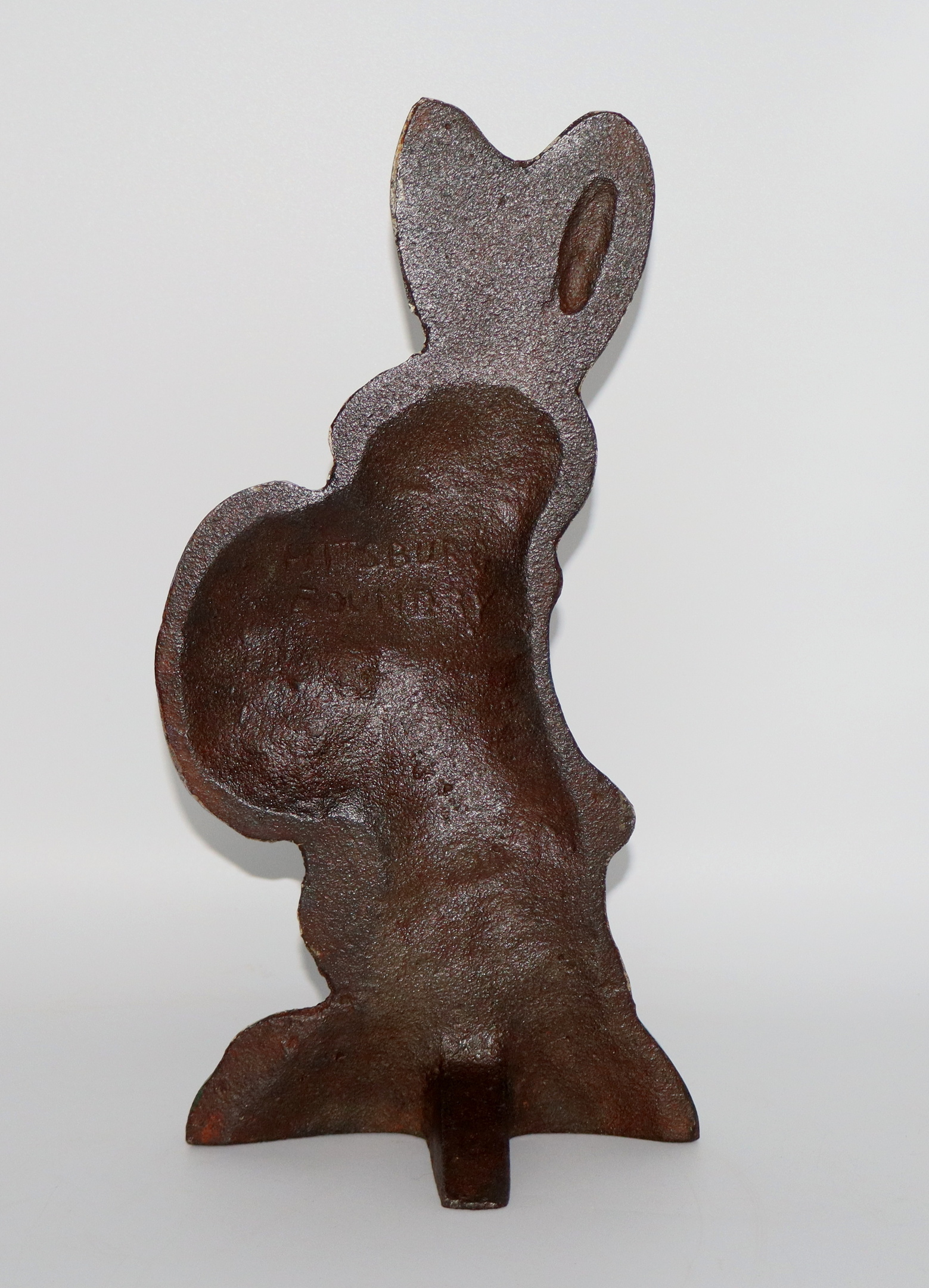 With the Easter season upon us, I thought I'd post one of my Easter Bunny doorstops. I love the design and all of the colors on this one. He was made about mid-century by Pittsburg Foundry. With that being said, the only Pittsburg Foundry I can find in all of my research is located in Pittsburg, TX. However, that Pittsburg Foundry makes branding irons. So, I'm unsure if that particular foundry made this one. This one is a fairly rare find in the doorstop world. So, I'm happy to have this one in my collection. He is marked by the foundry on the backside, as seen in pic #3. He is a wedge type and stands 10 3/4" tall, 5 1/4" wide and weighs 5lbs 7oz.