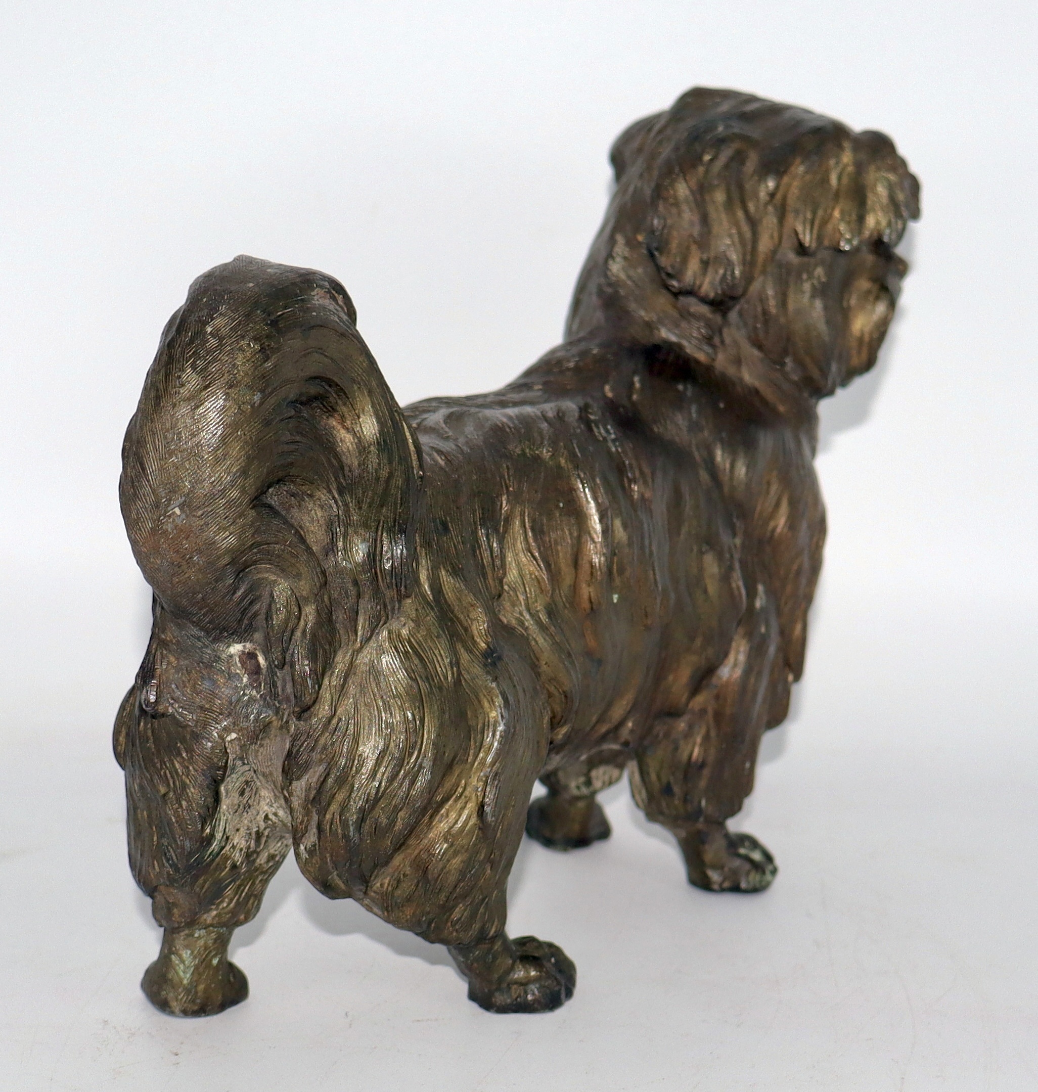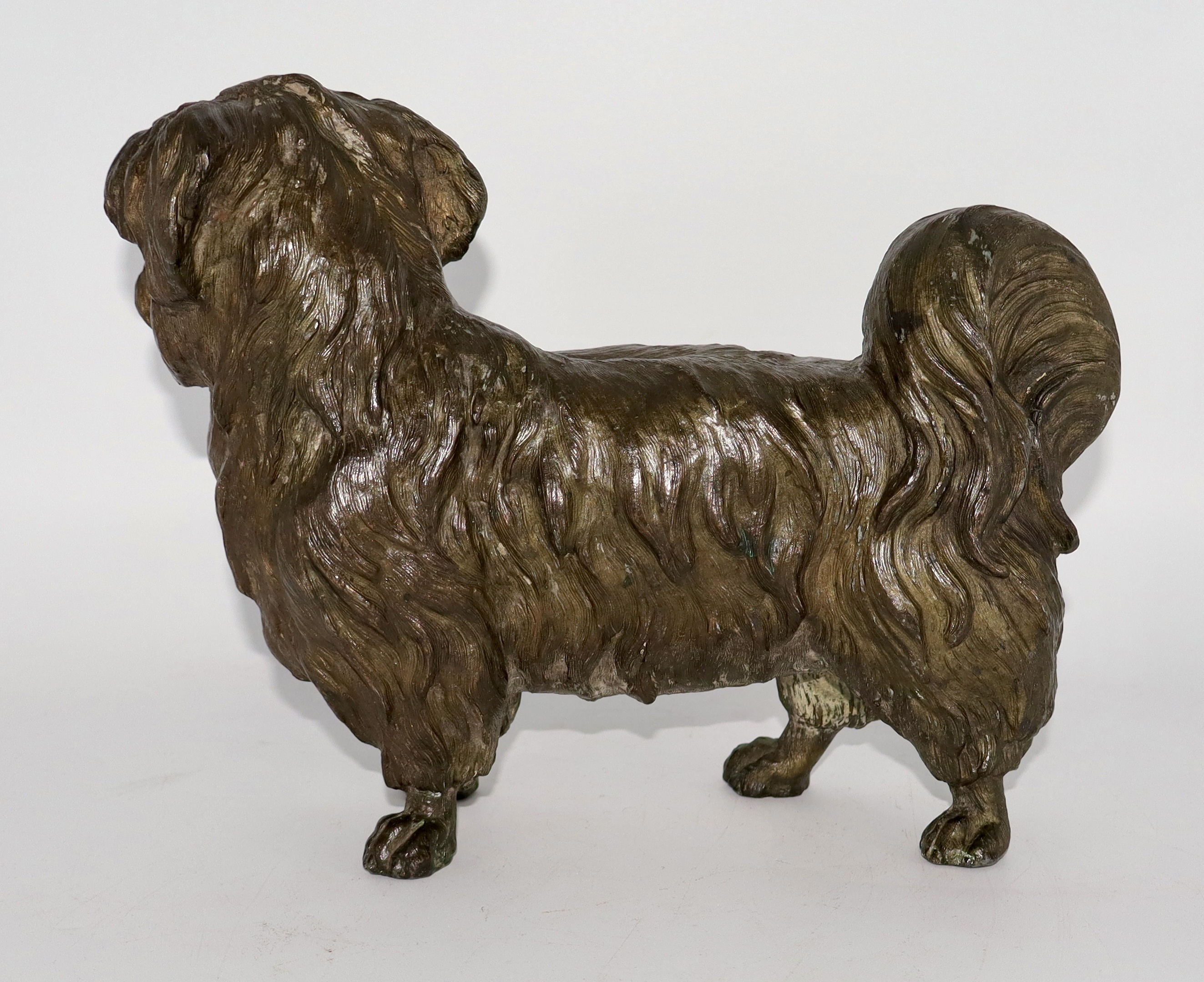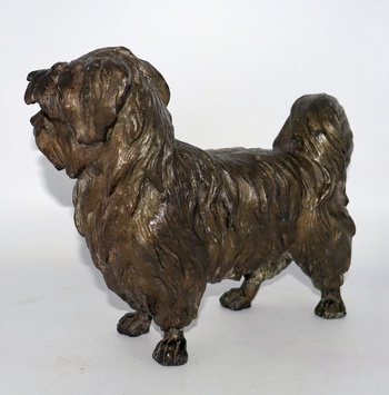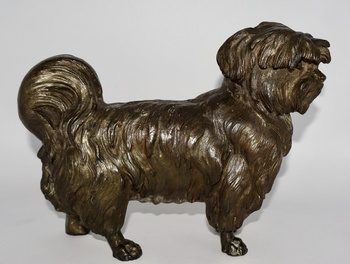 I just acquired this bronze plated Shih Tzu sculpture. The sculptor captured all of the fine details of this Shih Tzu perfectly. I love the patina on this one as well. I believe this is zinc spelter with bronze plating. Though it's heavy, it's definitely not cast iron or lead. This dates back to the late 1800's to very early 1900's. This Shih Tzu sculpture measures 7" tall, 9 1/2" long and weighs a bit over 7lbs.