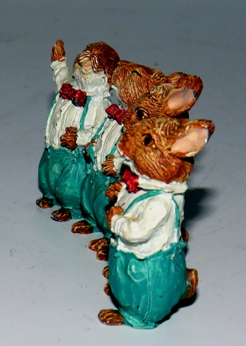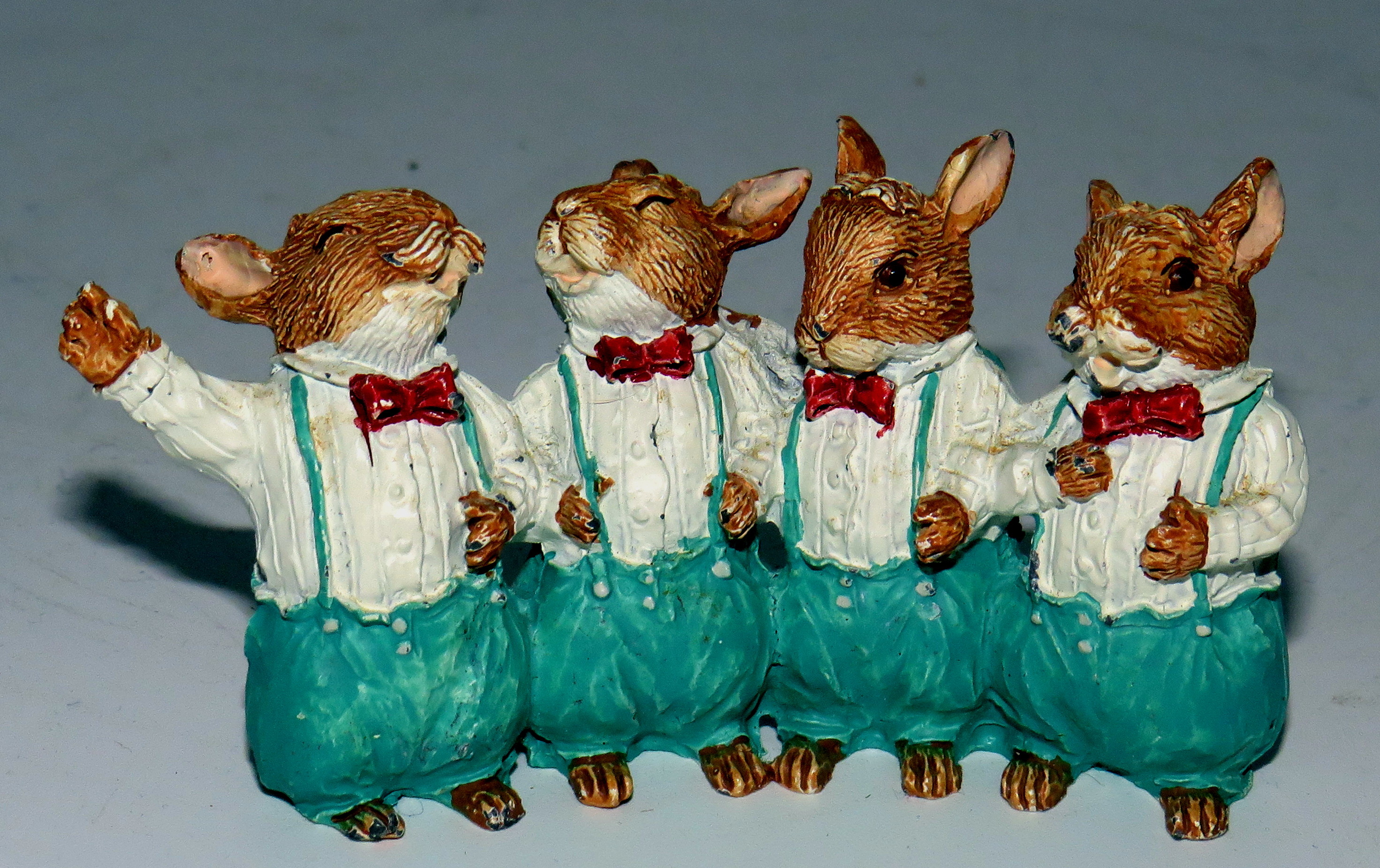 I recently came across this little rabbit barbershop quartet and couldn’t pass it up. They’re cold painted lead and very detailed. I love the handlebar mustaches and red bow ties. This rabbit barbershop quartet measures 3 1/4” long and 1 3/4” tall.