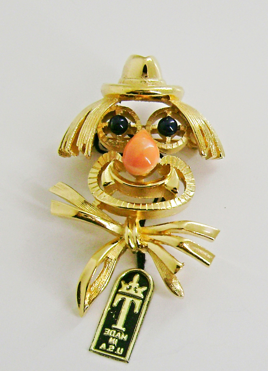 Crown Trifari Clown head brooch. With hat, stringy hair, wagon wheel black enamel eyes, peach enamel nose, big smile and bow tie.