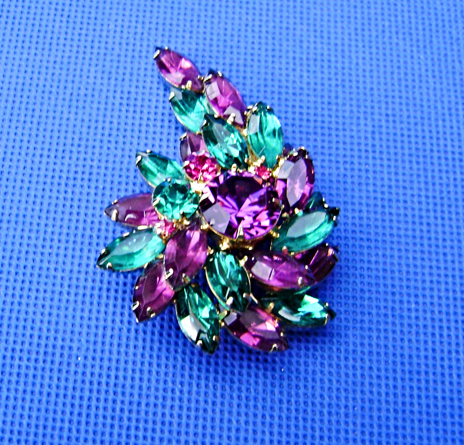 Verified Juliana flower brooch. With a Purple navettes and a large center Purple chaton. Teal - Blue navettes and a single chaton. Three pink accent stones. Double layered. Gold tone. 2-3/4".