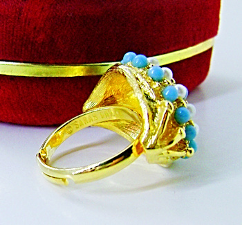 Vintage Sarah Coventry ring. In a polished gold tone, with simulated pearls and turquoise beads. The top is 3/4". From 1968. Fits most.