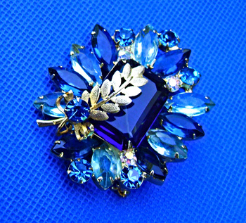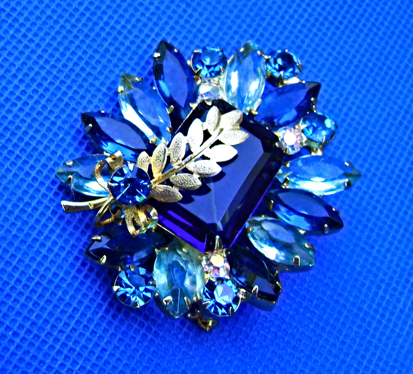 Verified Juliana Brooch. With a large rectangular center stone and sprig of gold leaves. AB chatons and open back shades of blue navettes. 2-1/8". Example of this brooch can be found at Is It Juliana Jewelry? Choose Brooch, Blue, Beaded No, Enamel No, Metal Accents, Leaf. Pg.1