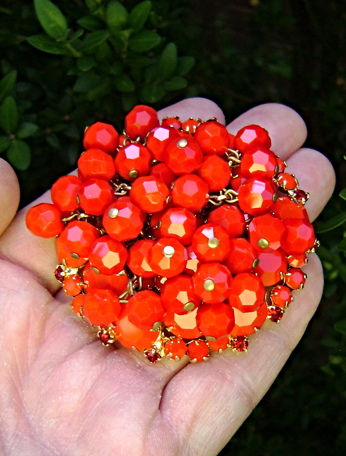 Beautiful Juliana brooch, the bright red beads give it dimension and movement, quite an eye catcher