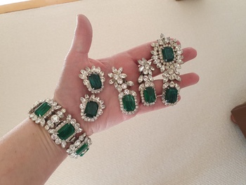 Fabulous set, love the large emerald green stones framed by sparkling 'ice.' No flaws that I can see looks perfectly gorgeous