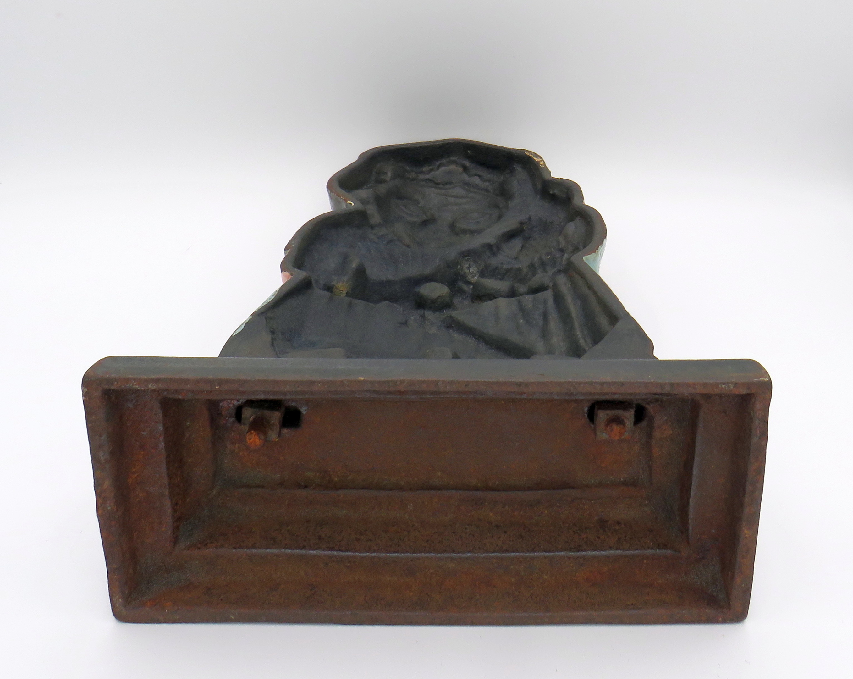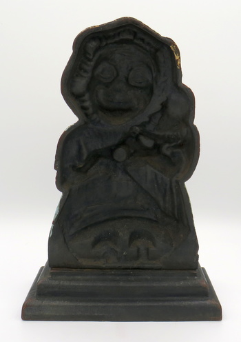 I recently came across this extremely rare cast iron doorstop and was overjoyed. So, I bought it right away. It's Judy, from Punch and Judy, and she's an English doorstop from the 1800's. She's 100% original and only missing minor paint chips here and there. This one is a two piece doorstop, as you'll see in pic #4. She's extremely difficult to find and carries a rather high value. If only I had Punch to go along with her, but hopefully I'll find a Punch doorstop in the coming years. Judy measures 12 1/8" tall and 8" wide. She weighs well over 10lbs!!