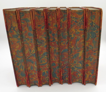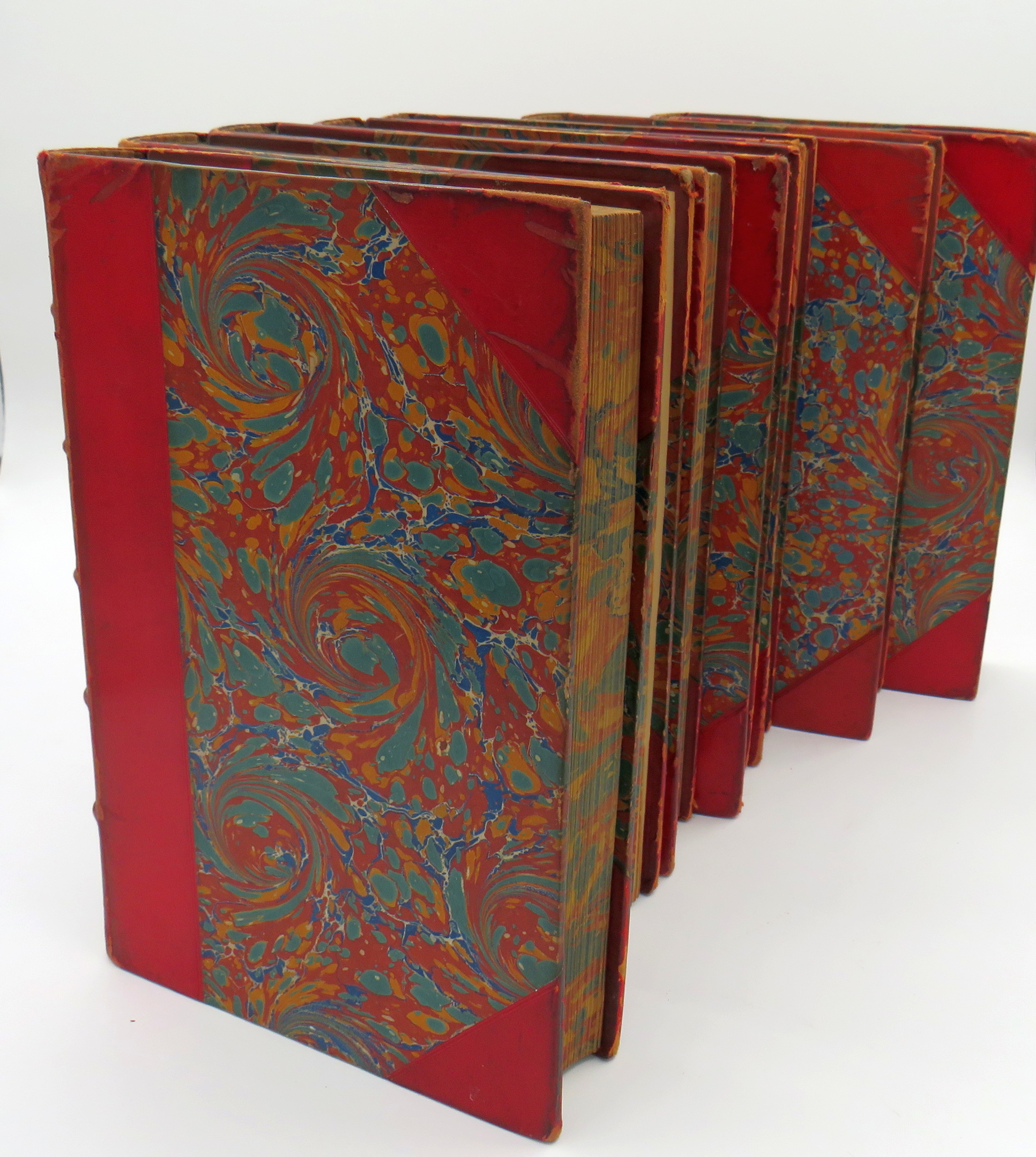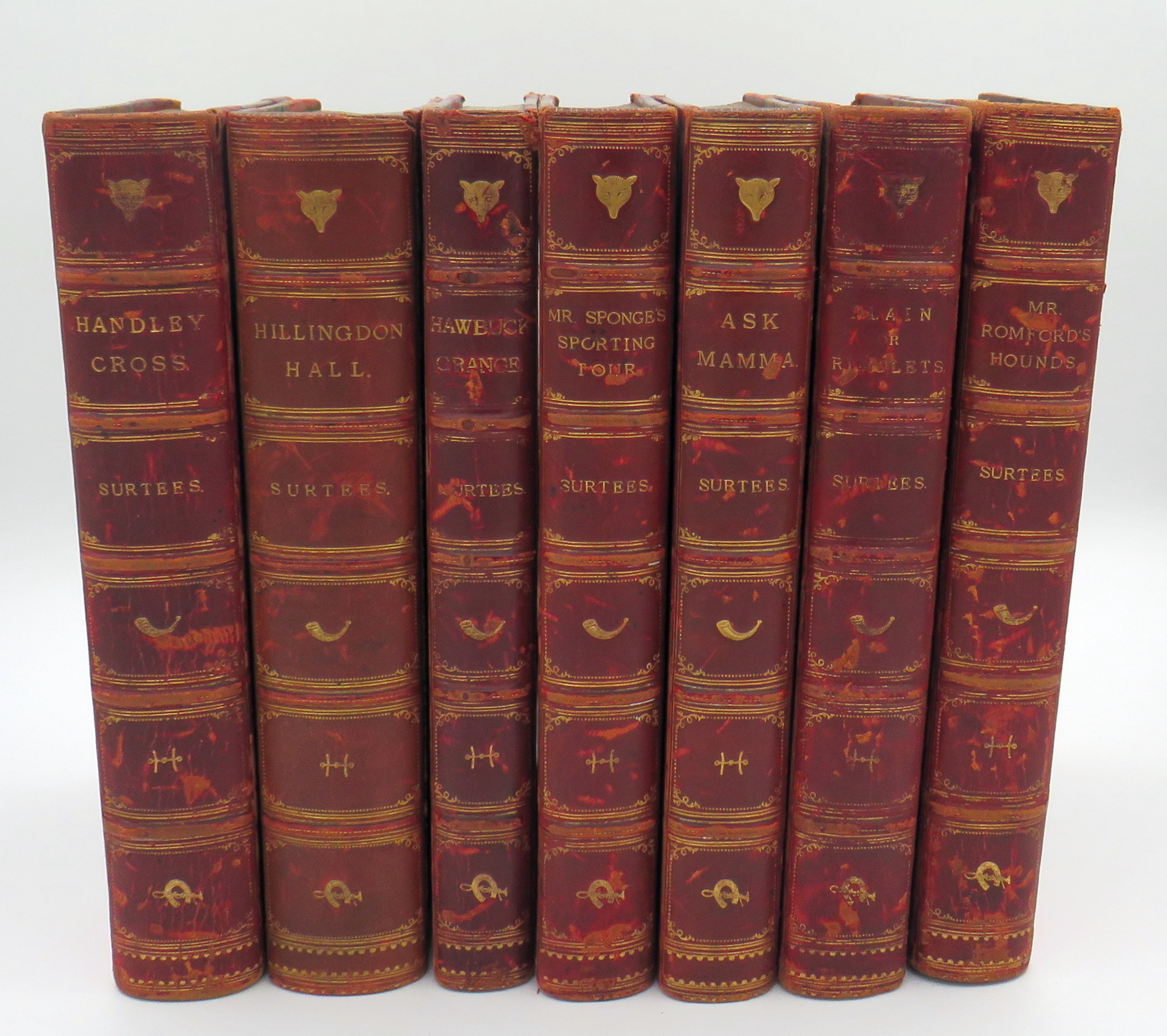 I've wanted a set of these Robert Smith Surtees leather-bound books for quite a while, but wasn't willing to pay the high prices that sellers are asking. Also, I've only seen partial sets of 6. I was able to find a complete set of 7, which I'd never seen until then, for a fantastic price. To find the complete set of 7 is extremely rare. They have such colorful marbled paperboards and endpapers and in such remarkable condition with most of the gold gilt remaining on the spines. Notice the foxes, hunting horns and riding crops on the spines of the books. Also, these books are exceptionally clean and have remarkably tight bindings as if they'd never been read by anyone. These are all original bindings and covers and beautifully done. This set is from the late 1800's and was printed in London by the Bradbury, Agnew & Co. The books are full of beautiful colored plates. Just a beautiful set of books. These books titles are as shown below: