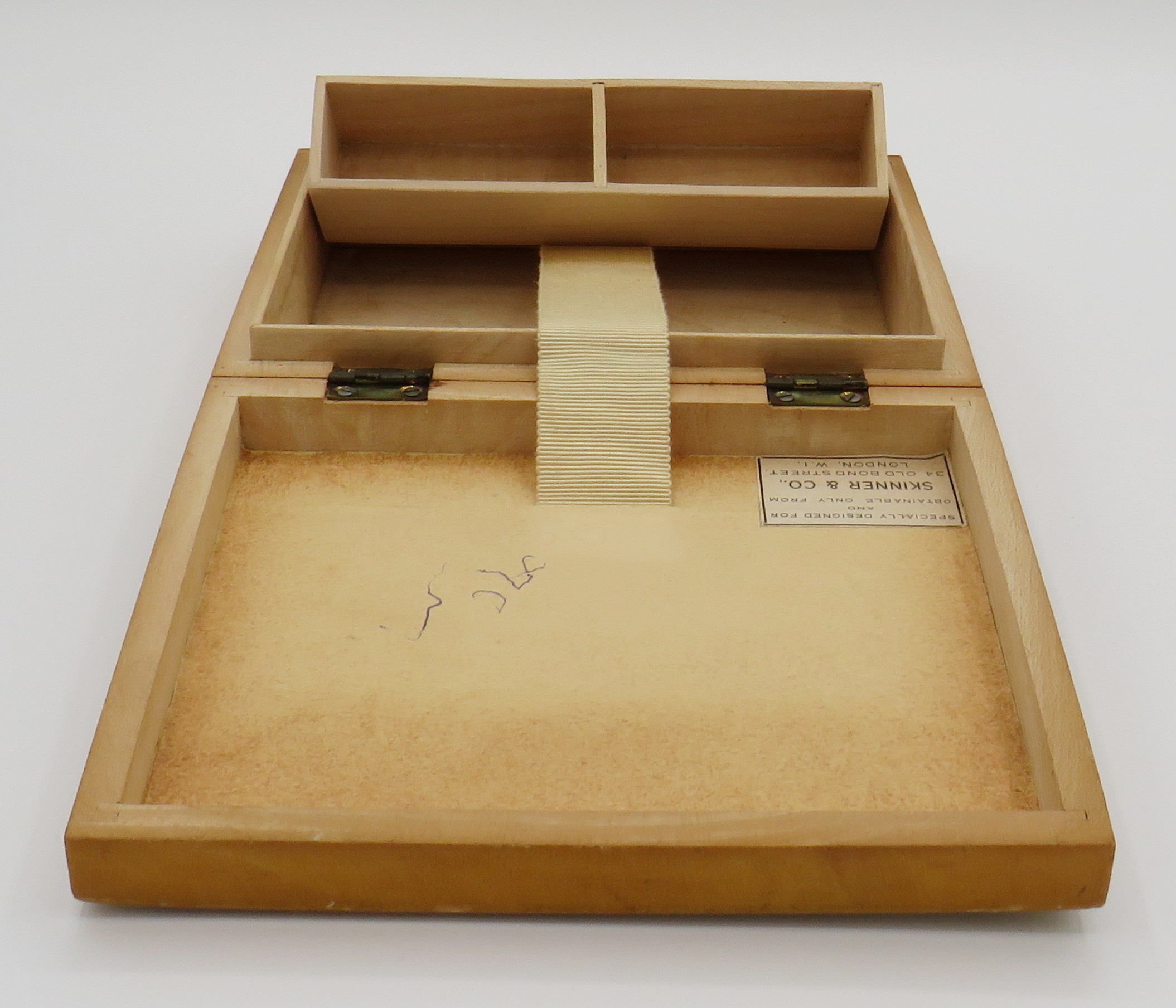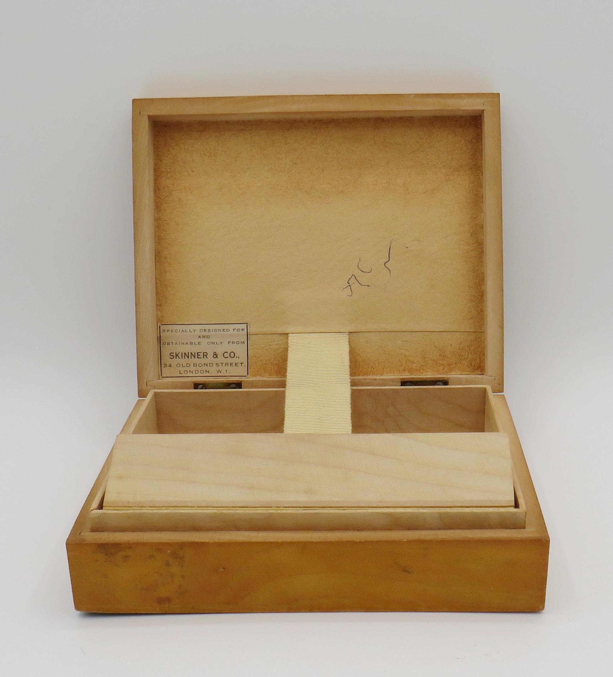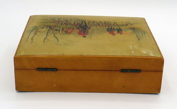 I have many items with hunt scenes and so I recently acquired this piece. It's a small Skinner & Co. jewelry box from the 1920's. It has a leather lining in the lid and has really held up well throughout the past 100 years. Skinner & Co. is now known as Bentley & Skinner. I love the beautiful hunt scene. It's signed by the artist, but I'm unable to decipher who the artist is. The box measures 5 3/4" long, 4 1/8 wide and 1 7/8" tall.