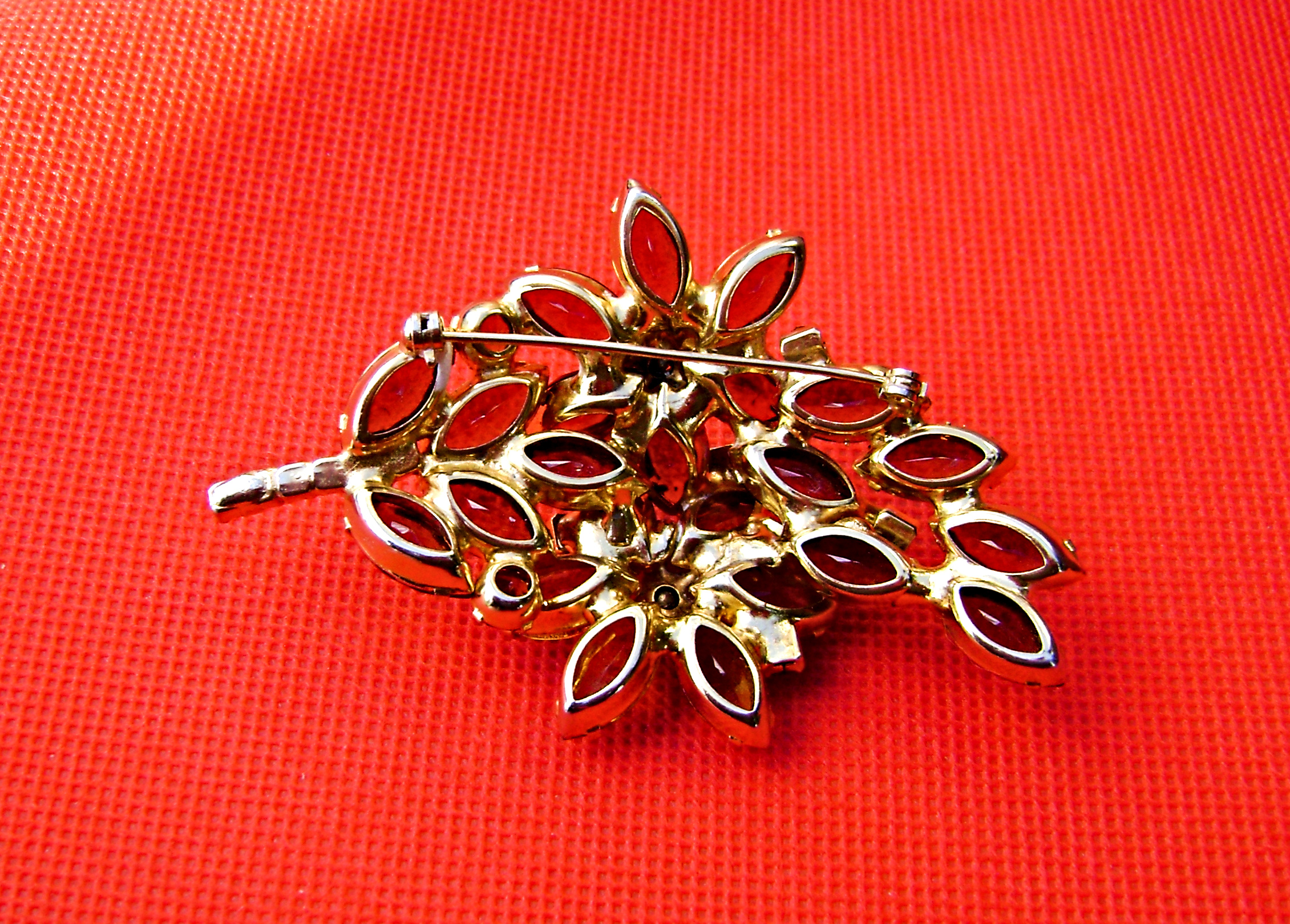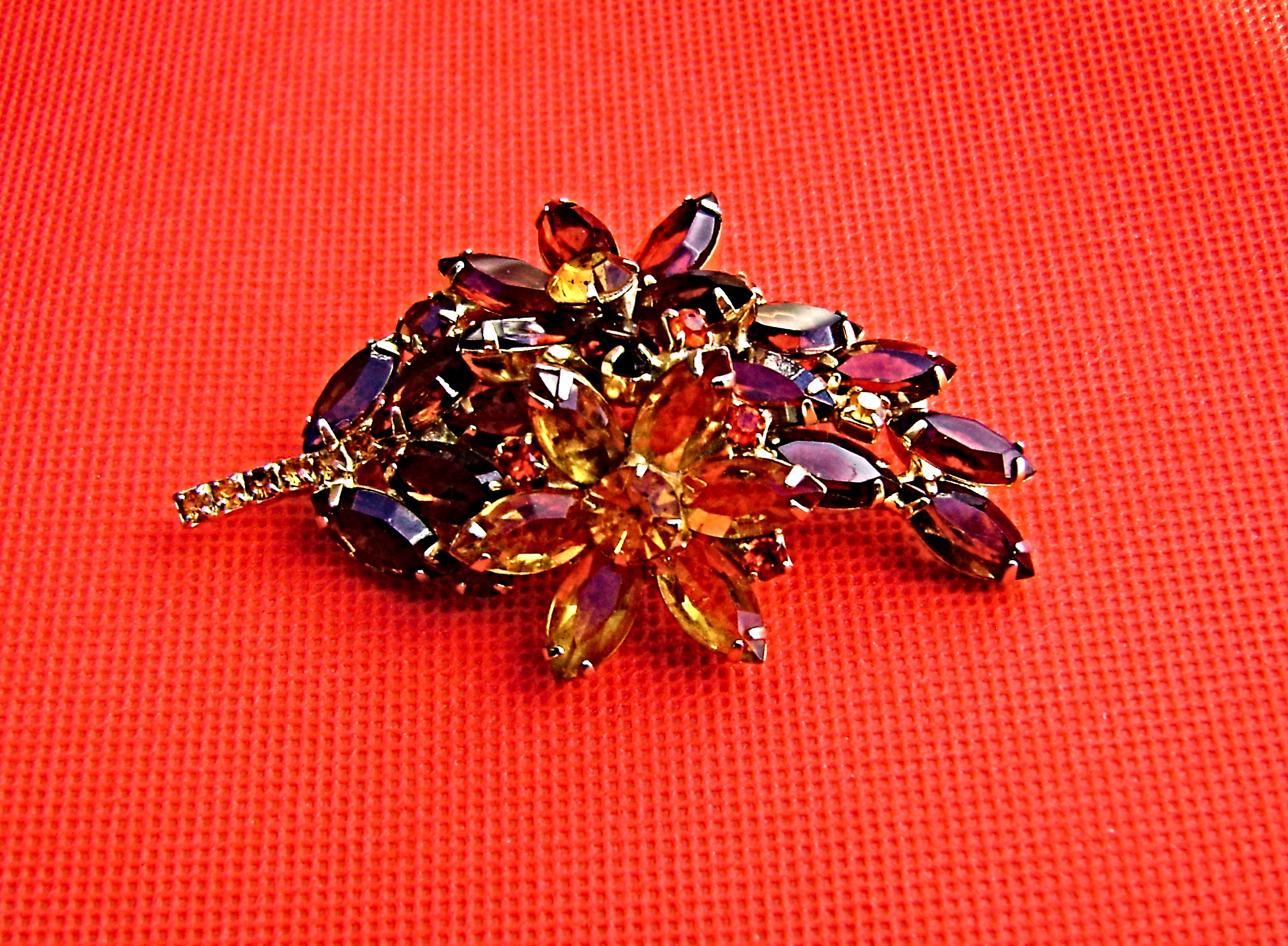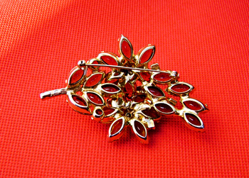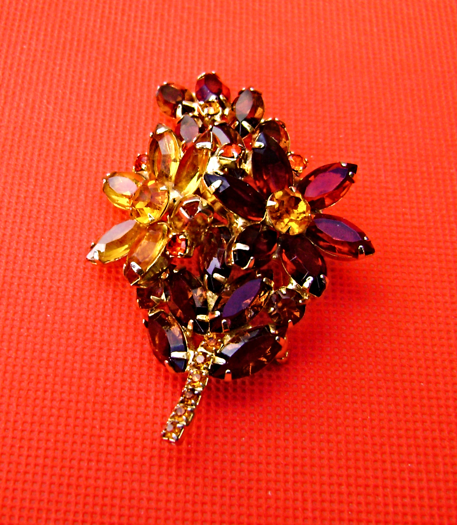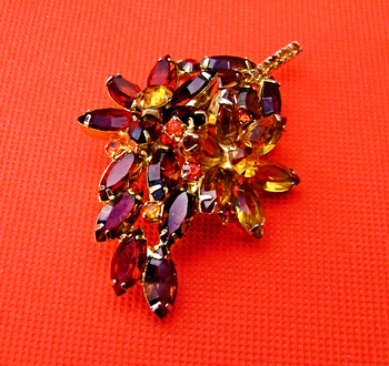 Delizza and Elster brooch. In the earth tone colors of Brown, Deep red, Orange, & amber. Two large flowers straddling a leaf. Open back rhinestones. Gold tone and is 3" tall and 2" wide. Hoping, Is It Juliana Jewelry? Will add this brooch soon.