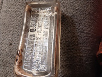 Here I got a self dug,pretty hard to find bottle,it reads The Alonzo O.Bliss Co. Washington-Kansas City-Chicago-San Fransisco,,On each side it says Montreal, Can and other says London Eng. I got lucky digging this one,cause there were only 2 intact bottles inside the 6' by 2' privy...I remember this hole very well,there was a sweet 1/2 gallon jug from the early 1860s or so but was broke in half,these things happen though...I'm sure I can speak for all bottle diggers when I say Heart breakers suck......
