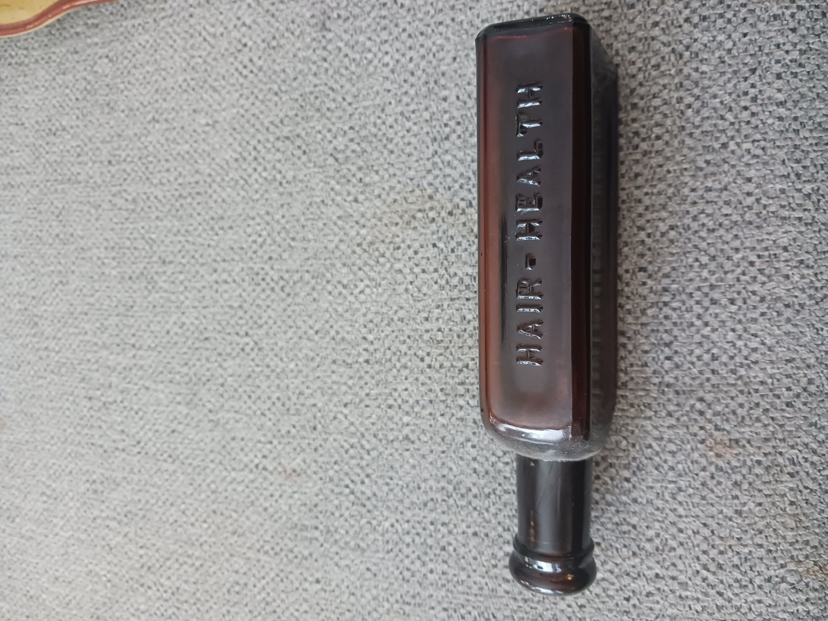 Here I have a self dug,Hay's Hair-Health..Stunner of a bottle,I dug this around the corner from my home down a too track,It used to be a wagon trail that led to more than 6 different homes...It's dark amber in color and shines bright upon my shelf...Great bottle very clean this is why it's apart of my collection..Tooled lip and blown in mold...I believe this dates to just turn of century early 1900s