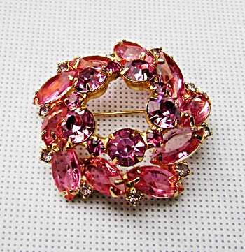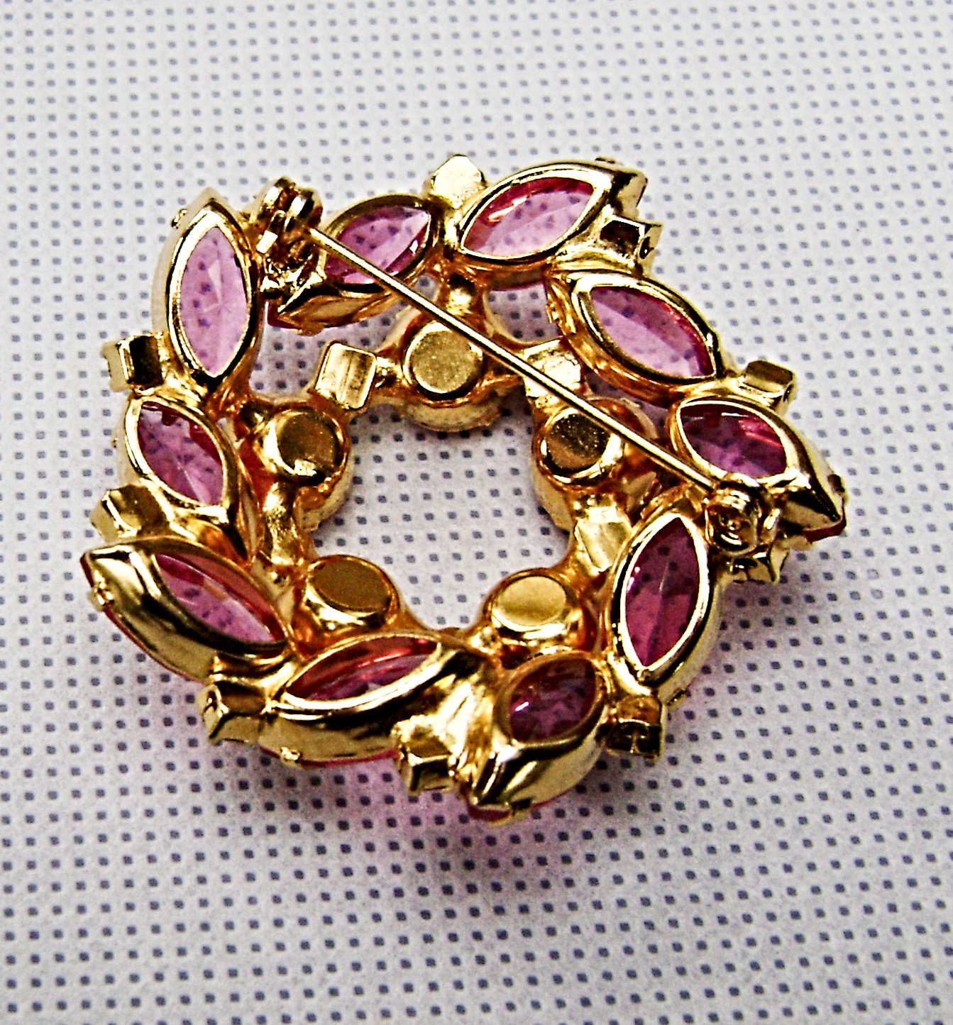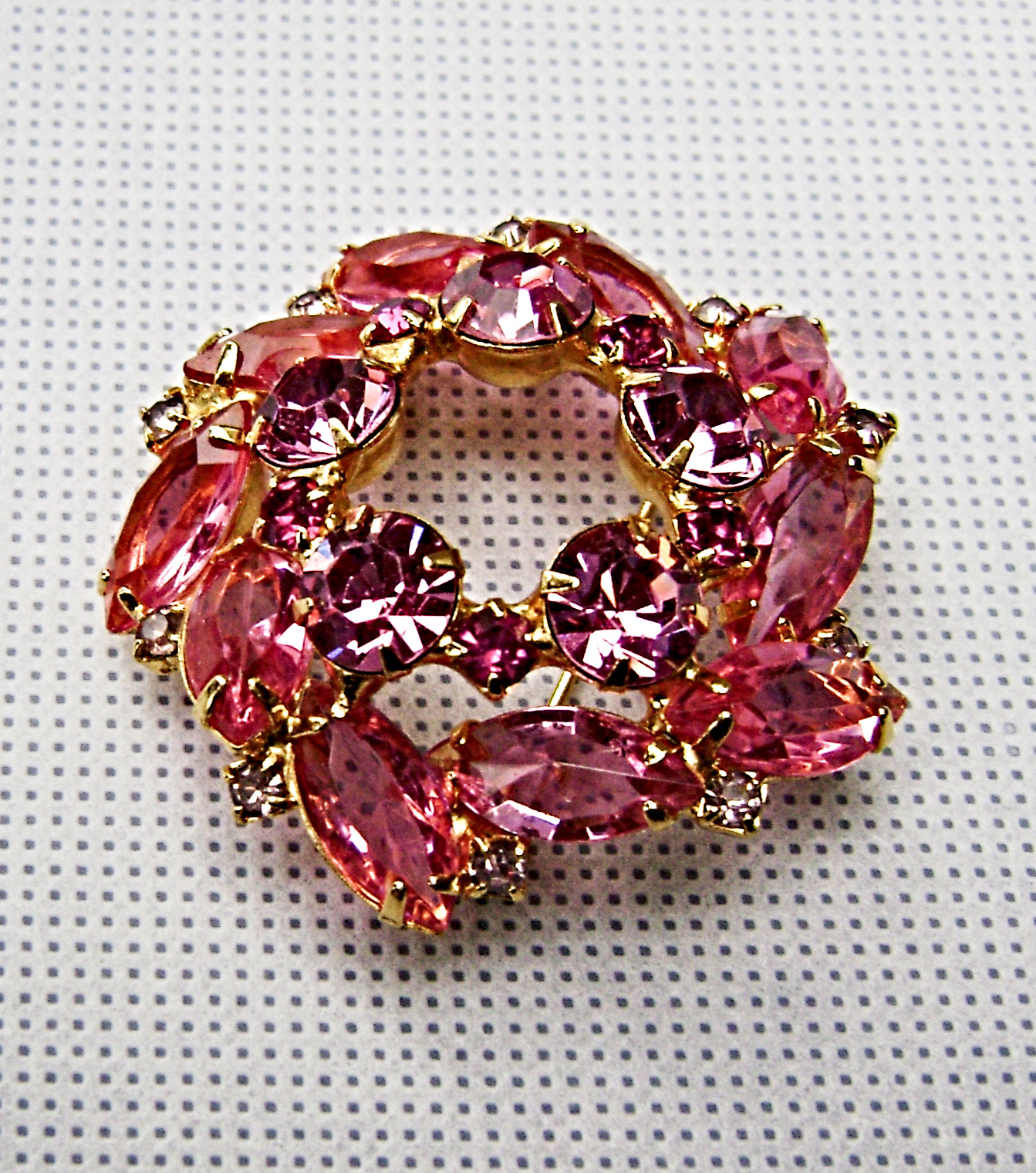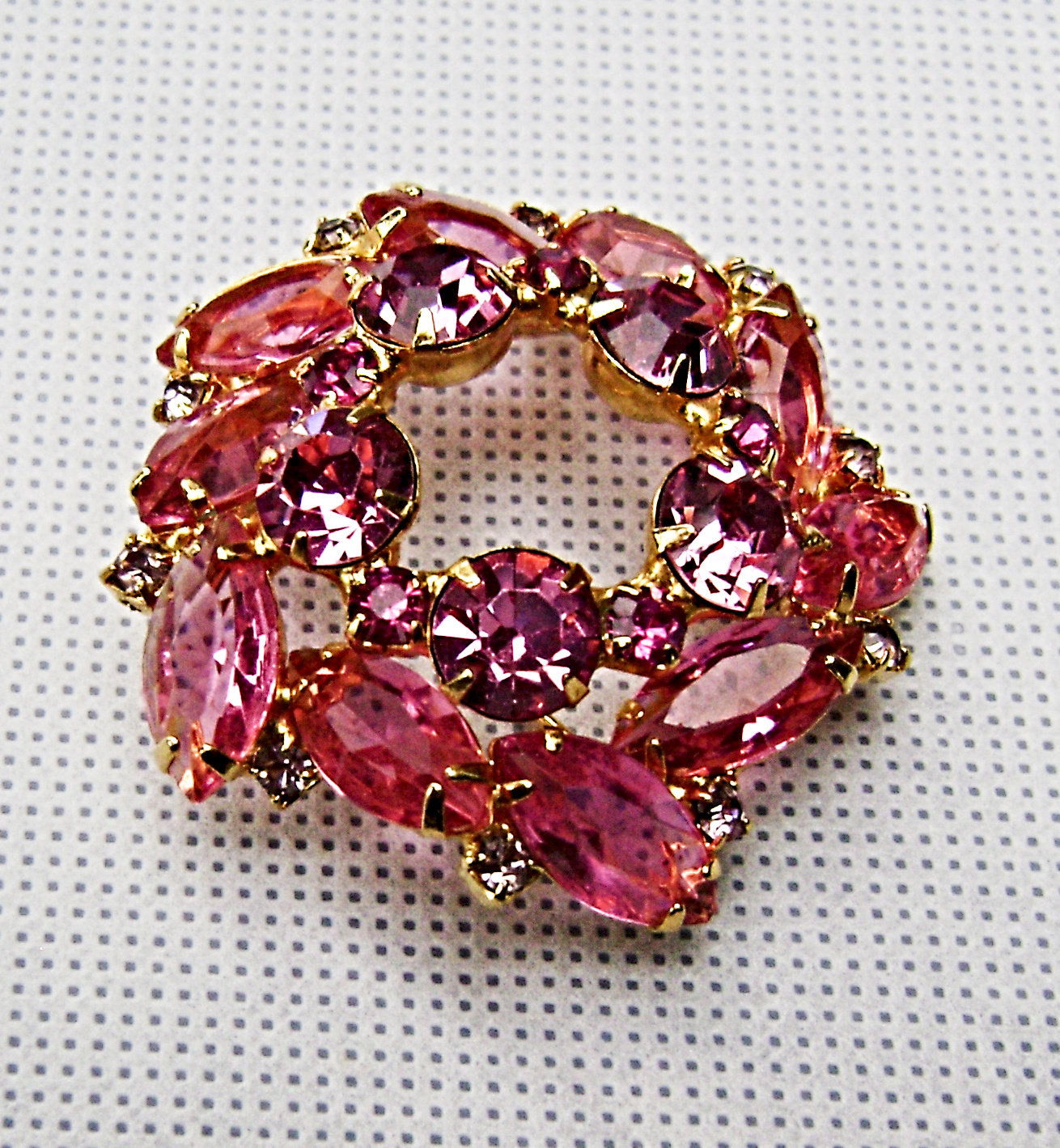 Verified D & E brooch. With open back shades of pink marquise rhinestones. Small alexandrite stones on the outer edge.