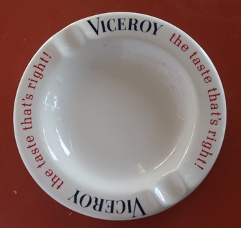 The Viceroy ashtray is made of ceramic and measures 12.7Cm in diameter. Rather than a maker's mark, its reverse features the Brown and Williamson Tobacco Company logo in what appears to be gold leaf.