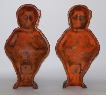 These are extremely rare to find and on the rare occasion that I do find a set of these, they're always far far out of my budget. So, when I came across these I snatched them right up for an amazing price. They're missing their horizontal shanks, but that's not a problem for me since I don't plan to be using these as they were intended. After cleaning these fellows, I gave each one a coat of clear sealer to protect them. I keep these fellows far out of my path as they each weigh 45lbs!!! They each measure 20 3/4" tall and 11" wide. So, quite large.